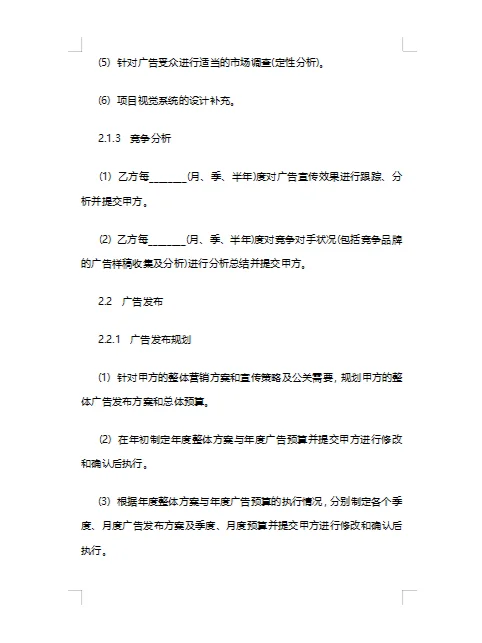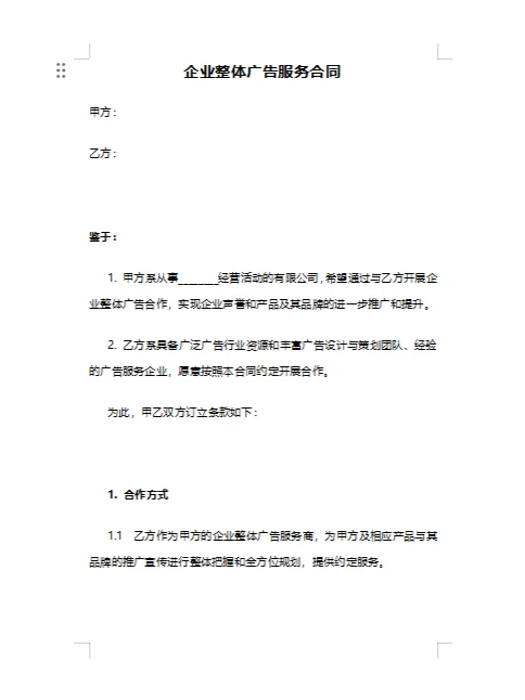 为企业整体广告服务合同起草秘密,让合作更顺畅! 大家好!今天,我想和您分享一下为企业起草整体广告服务合同的要点。在这个广告业蓬勃发展的时代,一份健全的合同可以成为保护双方权益的重要武器! 明确双方的身份和基本信息 在合同开始时,我们需要明确甲方(广告主)和乙方(广告服务商)的基本信息,包括他们的全名、地址、联系方式等。这些信息是合同的基础,必须准确无误,以免日后出现不必要的麻烦。 广告服务内容详细说明 在合同中,我们需要提供广告服务内容的详细描述,包括广告格式、广告渠道、发布时间、广告创意等。这些信息对确保广告效果和服务质量至关重要。记住要写得具体而清晰,以免将来出现歧义。 费用和支付方式 成本问题在合同中至关重要!我们需要就广告服务的成本、支付方式、支付时间等达成明确协议。记得写清楚,以免日后因成本问题而产生纠纷。 服务期和时间表安排 在合同中,我们需要明确规定广告服务的持续时间和每个阶段的工作时间表。这样,双方都可以有一个明确的时间表,以确保广告服务能够按时进行。 保密和知识产权条款 在广告服务过程中,双方都可能涉及敏感信息,如广告创意、客户信息等。因此,保密条款至关重要。同时,我们还需要明确知识产权的所有权和使用权,避免侵权纠纷。 广告效果的评估和接受标准 广告服务的最终目标是取得良好的广告效果。因此,我们需要在合同中明确广告效果的评估方法和接受标准。这样,乙方可以按标准提供服务,甲方也可以对广告效果有明确的判断标准。 违约责任及争议解决方法 为了保证合同的顺利履行,我们还需要就违约责任和争议解决方法达成一致。例如,如果一方违约,该怎么办如何解决双方之间的纠纷这些必须在合同中明确说明。 温馨提醒 在起草合同时,建议双方进行深入沟通,明确对方的需求和期望。这样可以避免在后续合作中出现不必要的误解和纠纷。同时,如果条件允许,最好聘请专业的法律顾问对合同进行审查和修改,以确保合同的合法性和有效性。 好了,以上就是为企业起草整体广告服务合同的要点!我希望这些小技巧能帮助到每个人,让我们在广告行业的旅程更顺利、更安心!