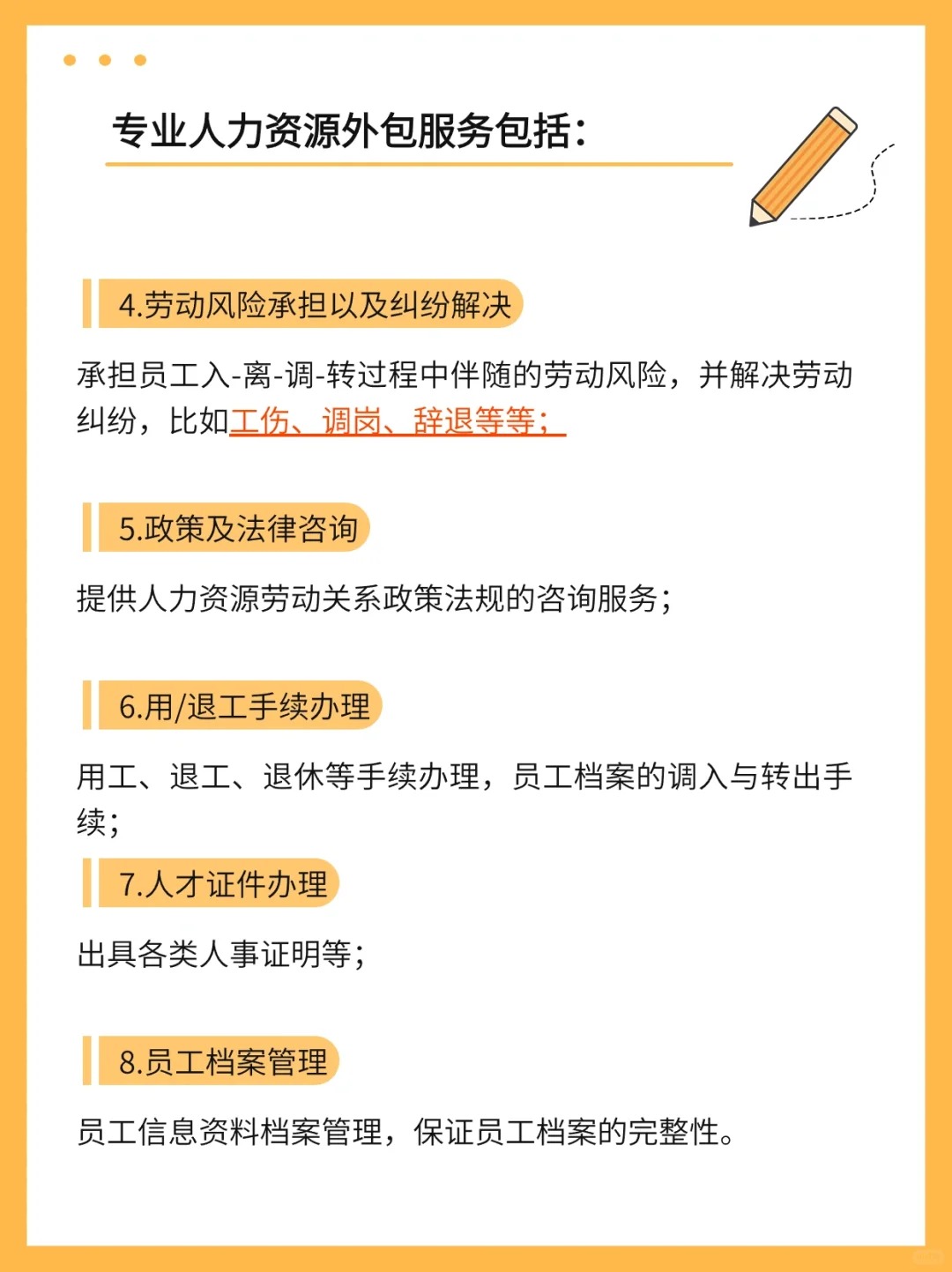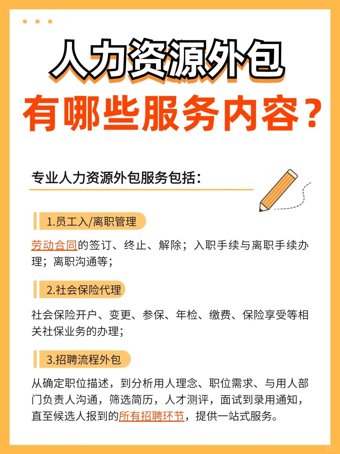 企业将人事管理的部分或全部工作外包给专业的三方机构来完成,目的在于减少人力资源事务性工作以及降低劳动风险,有效提高HR效率,使企业能够聚焦核心人才、业务以及附加值高的业务 人力资源外包服务主要包括以下内容: 1.员工入/离职管理 2.社会保险代理 3.招聘流程外包 4.劳动风险承担以及纠纷解决 5.政策及法律咨询 6.用/退工手续办理 7.人才证件办理 8.员工档案管理 人力资源外包对HR的主要好处体现在: 1.缺工季到来时,不用做空中飞人,跑各地招聘市场 2.处理员工档案/用工/退工/社保等问题时,省得频繁去办事窗口排队 3.出现劳动纠纷时,免去费心处理 总结: 企业采用人力资源外包后,不需设立专门人员对员工进行详细繁琐的人力资源处理,这些人员从招聘、合同签订,薪酬发放,以及社报缴纳、工伤申报、劳动纠纷处理等诸多人力资源事务性工作均由人力资源外包公司担任完成,省时省力! 人力外包作为一种流行的管理模式,确实能为企业带来提升核心竞争力、降低成本、留住优秀员工等好处。然而,它也存在一些不容忽视的风险和挑战:信息泄露风险,员工利益分歧,企业文化融合挑战。 为了规避这些风险,企业可以采取以下措施: 严格筛选外包公司:在选择外包合作伙伴时,应进行严格的资质审查,确保其拥有足够的专业能力和信誉。 加强合同管理:通过详细的服务合同来规范双方的权利和义务,明确数据保护和信息安全的相关条款。 建立监督机制:定期评估外包服务商的服务质量和风险管理能力,确保其符合企业的标准和要求。 增强内部沟通:加强与员工的沟通,解释外包的必要性和益处,减轻员工的顾虑和抵触情绪。 文化整合策略:选择与企业自身文化相契合的外包服务提供商,或对外包人员进行企业文化培训,以促进文化的融合。