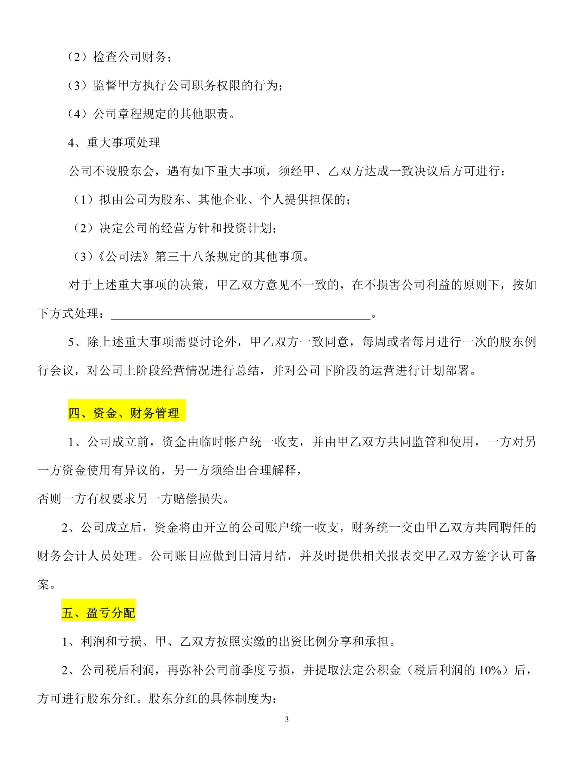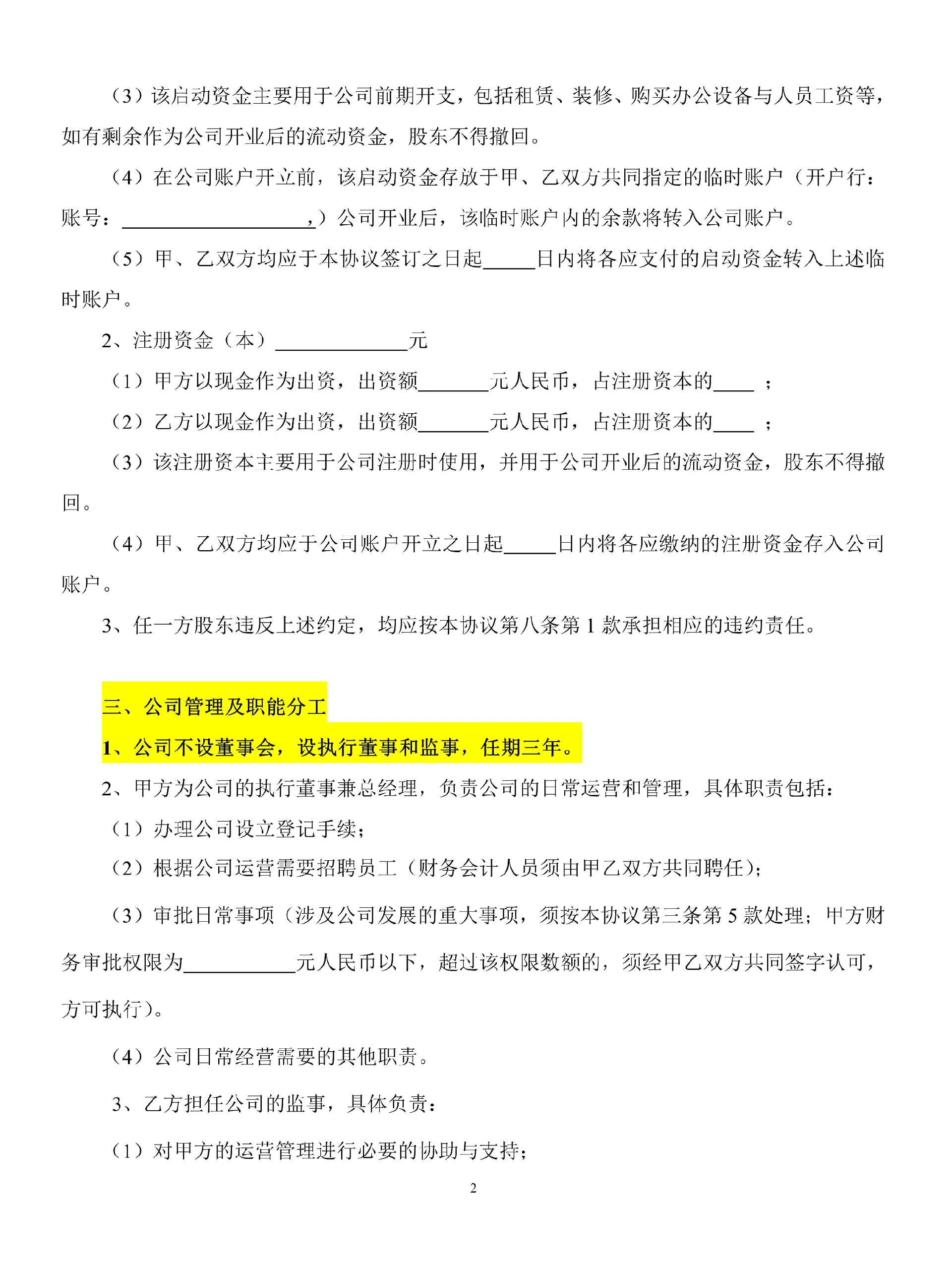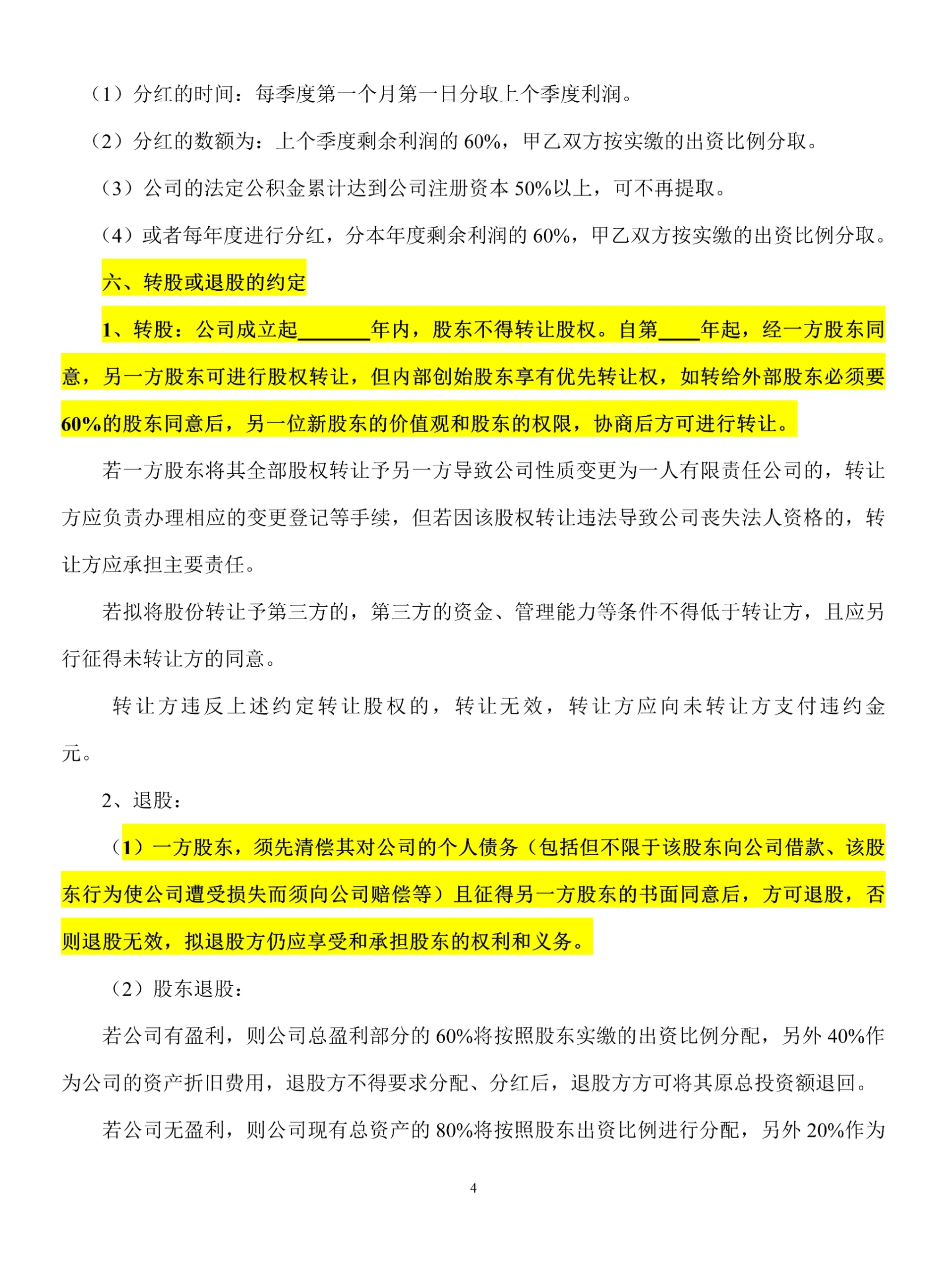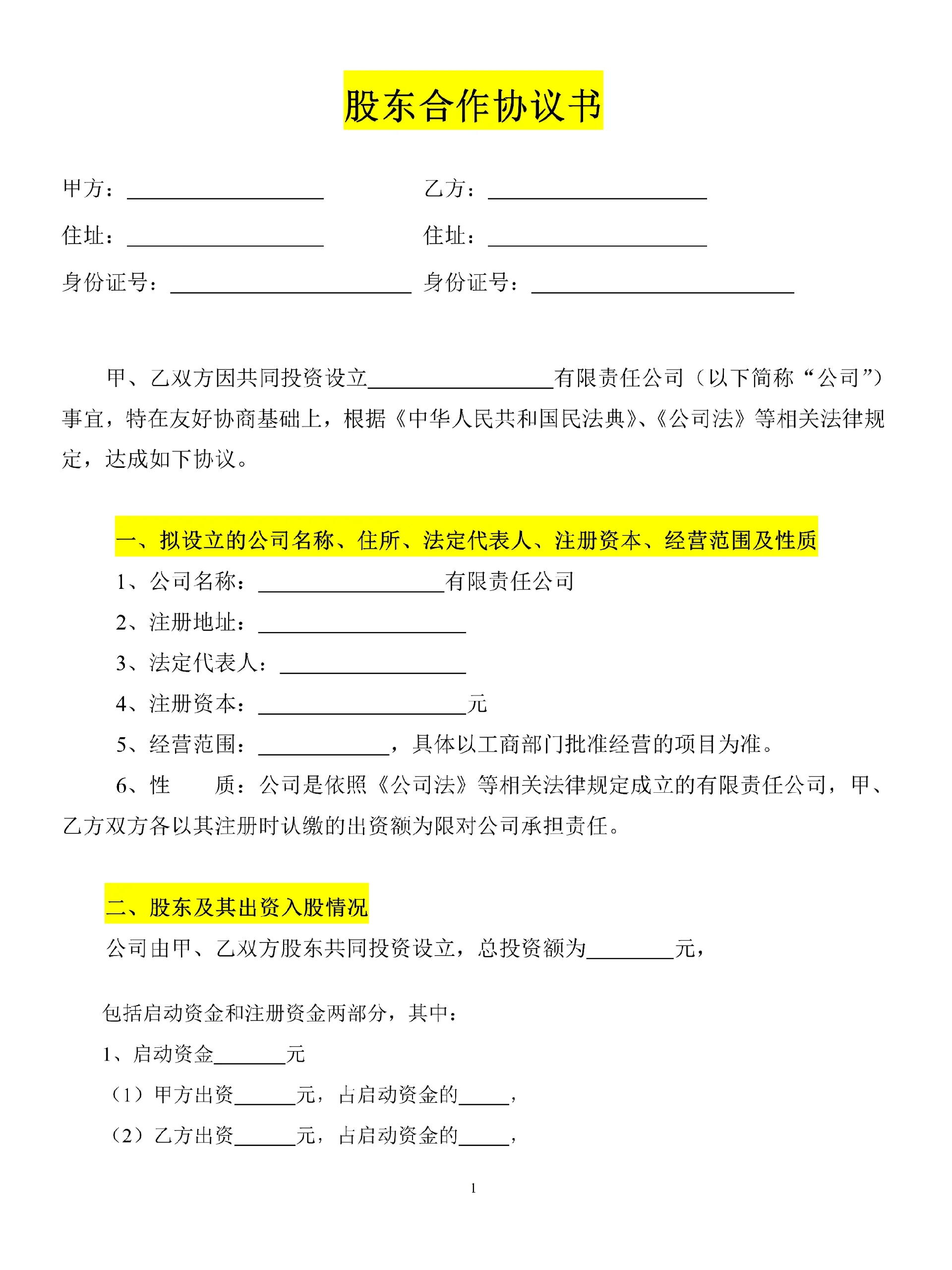 股东合伙协议模板的电子版:如何为两人合伙公司分配股份和支付工资。合作伙伴协议合同模板。 条款明确,内容严谨规范,主要内容包括:出资额、持股比例、分红比例、分工、决策机制、进入和退出机制、竞业限制、违约责任。股东合伙协议必须包括这句话。本合伙协议的任何条款与公司章程相抵触的,以协商一致的内容为准