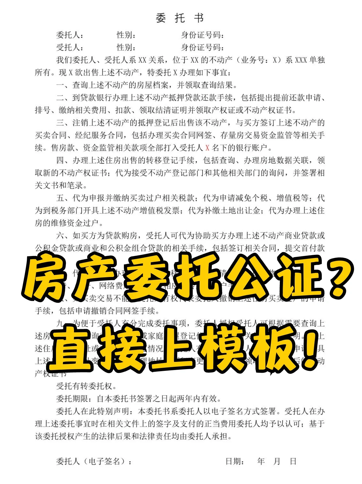 不管是人在异地还是国外,其实都可以线上公证房产委托,不需要自己跑来跑去! 需要房产委托书模板的,拿着不谢! 委托人:XXX男,公民身份号码:XXXXXXXXXXXXXXXXX 受托人:XXX女,公民身份号码:XXXXXXXXXXXXXXXXX 位于某某市XXXXXXXXXXXXXXXXXXXXX的房产(房屋所有权证编号:XXXXXXXXXXXXXXXXXX号)系我委托人单独所有,现我欲出售上述房产,因事务繁忙,特委托XXX为受托人,办理如下事项: 一、代为办理提前还款手续,领取还款证明; 二、领取解除抵押证明材料,办理解除抵押登记及与之有关的一切手续,领取解除抵押登记后的房产证;办理央产房上市审批手续; 三、代为签订房屋买卖合同,代办网签手续及注销网签手续; 四、到相关房管局查阅该房地产档案,核实房屋是否存在抵押、查封、网申占用、异议登记等信息; 五、到相关房管局代为调取原购房合同、原契税票等相关资料; 六、待上述房产符合出售条件后,有权代为办理上述房屋的立契过户、权属登记相关一切手续; 七、待上述房产符合出售条件后,有权代为办理上述房地产的产权过户、税务登记等一切手续; 八、代为缴纳转让上述房地产过程中的有关税、费; 九、转让房地产过程中,有权代为接受房屋管理部门的询问并签署文件; 十一、代收出售上述房产的房款并签署相关文件; 十二、代为办理房地产交易资金监管手续并签署资金监管协议及相关文件; 十三、代为办理商业贷款手续等事宜; 受托人有转委托权。 委托期限:自签字之日起至上述事项办理完为止。 委托人在此特别声明:本委托书系委托人以电子签名方式签署。受托人在办理上述委托事宜时在相关文件上的签字及支付的正当费用委托人均予以认可;基于该委托授权产生的法律后果和法律责任均由委托人承担。 委托人(电子签字): 日期: