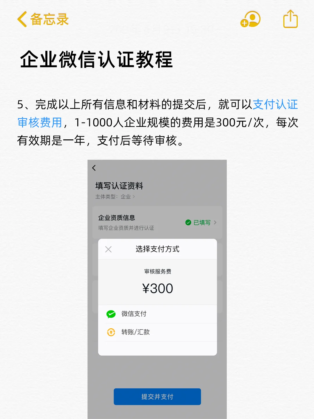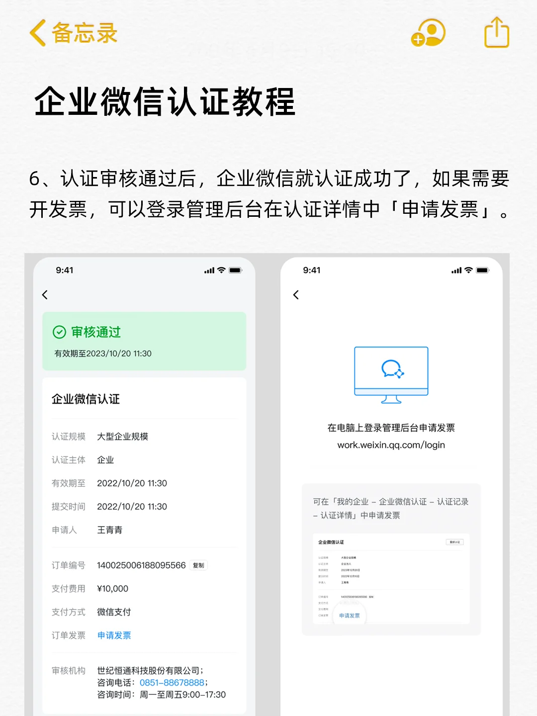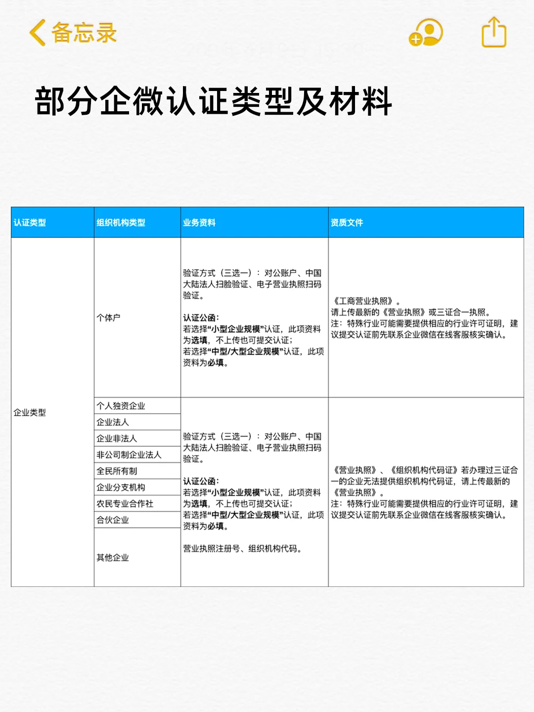 建议企业主注册企业微信,并尽快完成微信认证。经过身份验证后,有许多功能性权利和利益,应用范围更广,安全系数更高。是企业和员工管理的重要一步,也是构建基于微信生态的私域流量池、进行客户运营管理的核心环节 首先,需要准备一些材料,可以根据图3中的表格提供相应的材料。然后用手机登录奇伟并开始身份验证: 选择Workbench-Manage Enterprise,转到Enterprise Information部分进行认证,按照提示选择您的企业规模,审查需要准备的材料,并确保提前准备好这些材料,以避免重复提交修改而浪费时间。 启动身份验证,按照提示选择实体类型,填写企业资质信息,验证实体,然后填写操作员信息。请注意,在绑定之前,操作员必须完成个人实名认证。 填写企业规模信息。在这里,您需要上传企业规模认证信。提前准备好并上传。 填写公司缩写。 提交并支付认证审查费。1-1000人的企业规模收费为300元/次,每次有效期为一年。付款后,等待审查。 验证无误后,企业微信认证成功,支持开发票证。