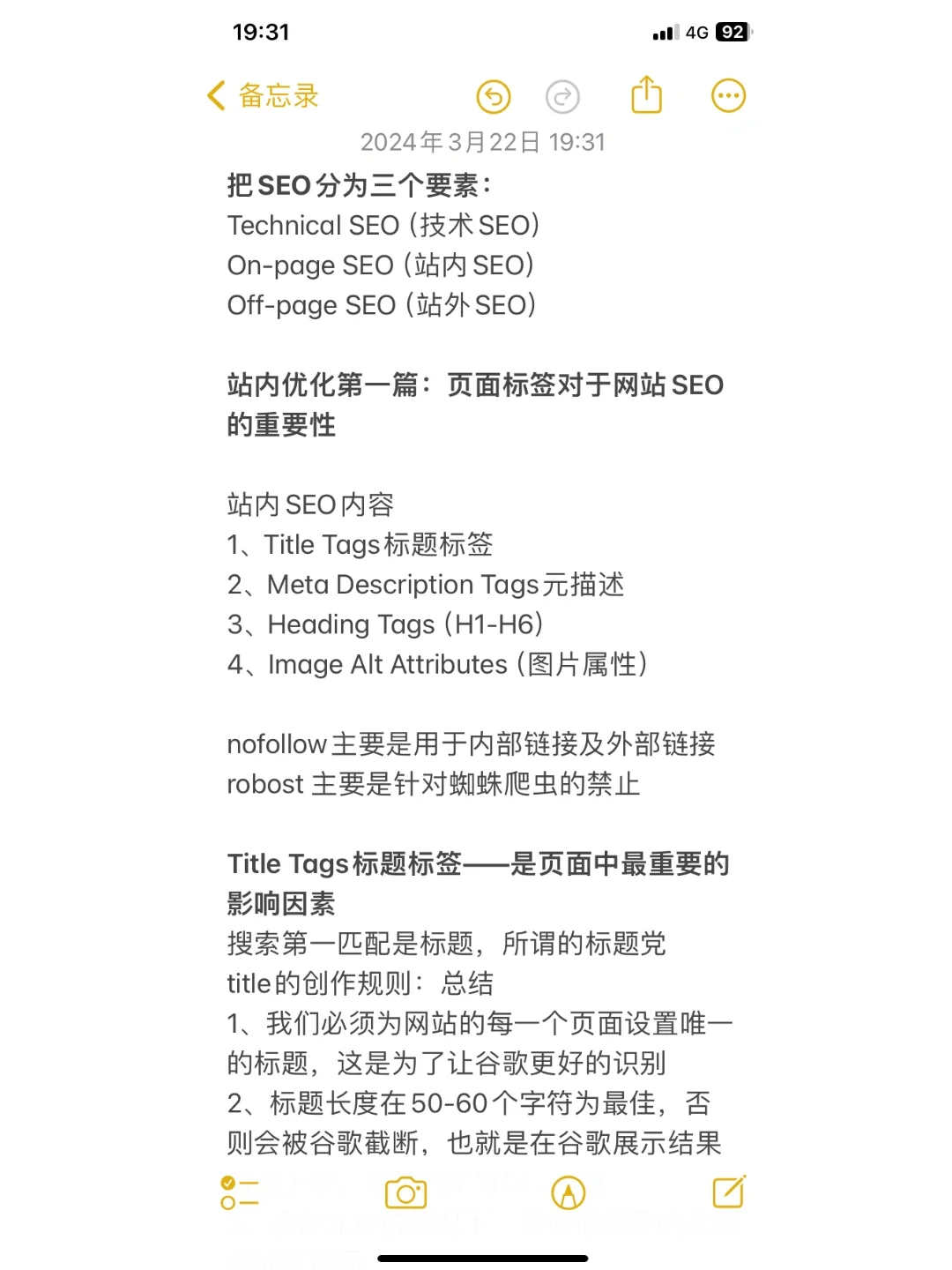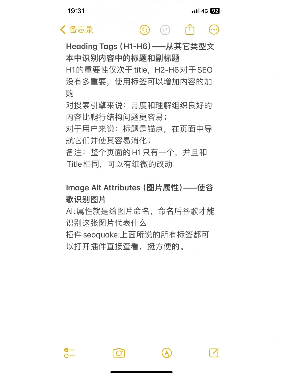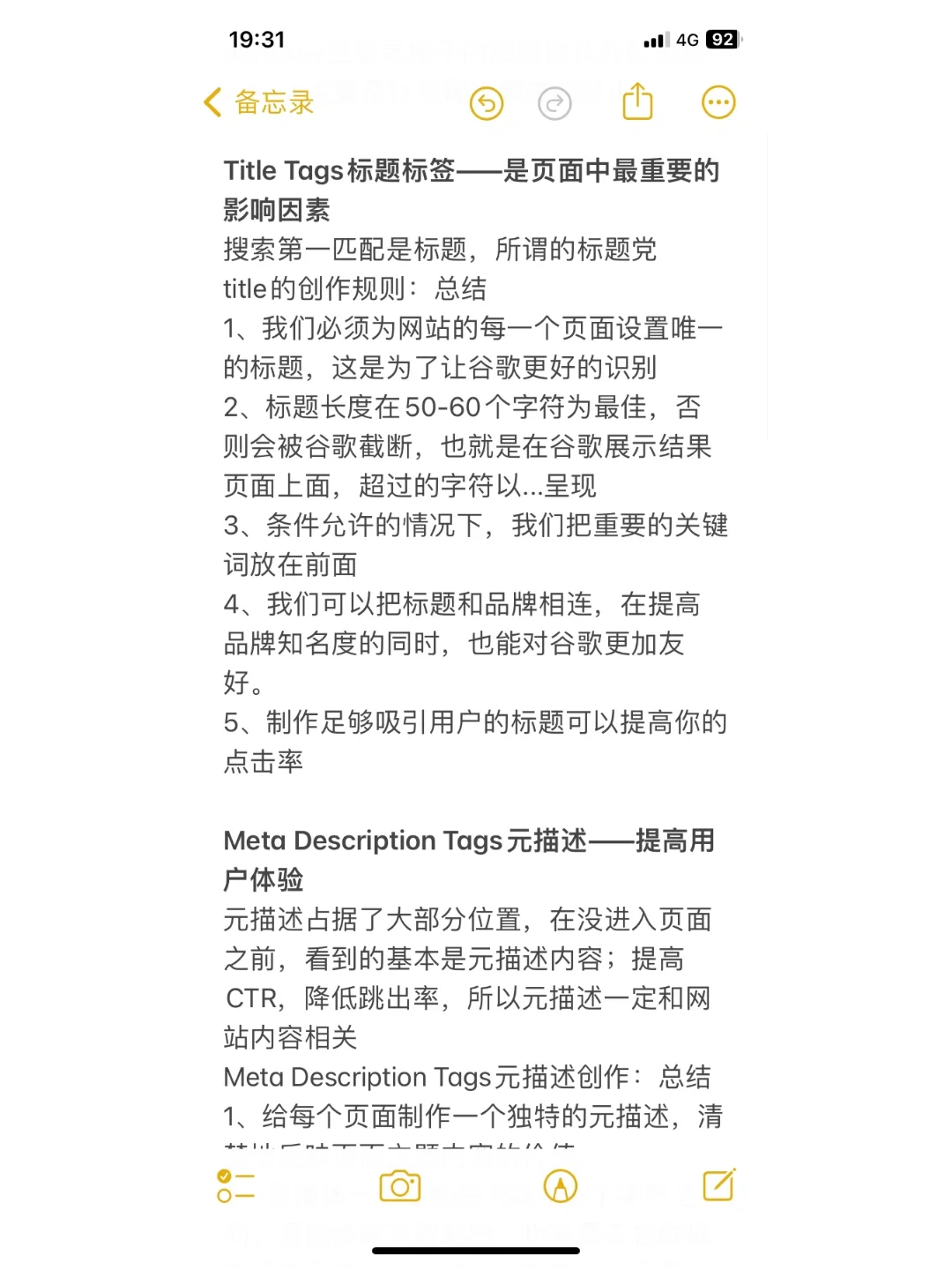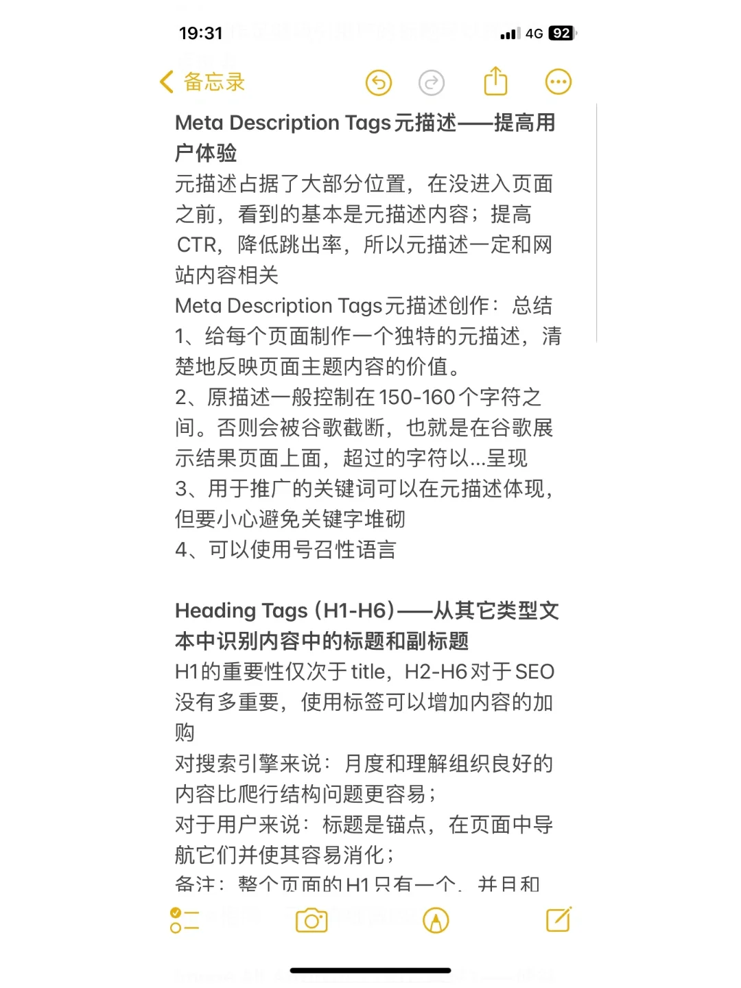 网站SEO内容 1.标题标签 2.元描述标签 3.标题标签(H1-H6) 4.图像替换属性 标题标签-页面上最重要的影响因素 搜索中的第一个匹配项是标题,即所谓的标题党 标题的创作规则:总结 1.我们必须为网站的每个页面设置一个唯一的标题,以便谷歌更好地识别它 2.标题的最佳长度在50-60个字符之间,否则它将被谷歌截断,这意味着在谷歌显示结果页面上,任何超过此限制的字符都将出现 3.如果条件允许,我们会优先考虑重要关键词 4.我们可以将标题与品牌联系起来,这不仅提高了品牌知名度,而且使其对谷歌更友好。 5.创建对用户足够有吸引力的标题可以提高你的点击率 元描述标签-改善用户体验 元描述占据了大部分空间,在进入页面之前,你看到的基本上是元描述的内容;提高CTR并降低跳出率,因此元描述必须与网站内容相关 元描述标签创建:摘要 1.为每个页面创建一个唯一的元描述,清楚地反映页面主题内容的价值。 2.原始描述一般控制在150-160个字符之间。否则,它将被谷歌截断,这意味着在谷歌显示结果页面上,将出现超过限制的字符 3.用于推广的关键词可以反映在元描述中,但要小心避免关键词填充 4.能使用有说服力的语言 标题标签(H1-H6)-从其他类型的文本中识别内容中的标题和副标题 H1的重要性仅次于标题,H2-H6对SEO来说不是很重要。使用标签可以增加内容的购买量 对于搜索引擎来说:每月组织良好的内容比爬行结构问题更容易理解; 对用户来说:标题是锚,在页面中导航,使其易于消化; 注意:整个页面上只有一个H1,与标题相同,可以稍作修改 图像替换属性-使谷歌能够识别图像 Alt属性是为图像命名,谷歌只有在命名后才能识别图像所代表的内容 插件SEOquake:打开插件可以直接查看上面提到的所有标签,非常方便。