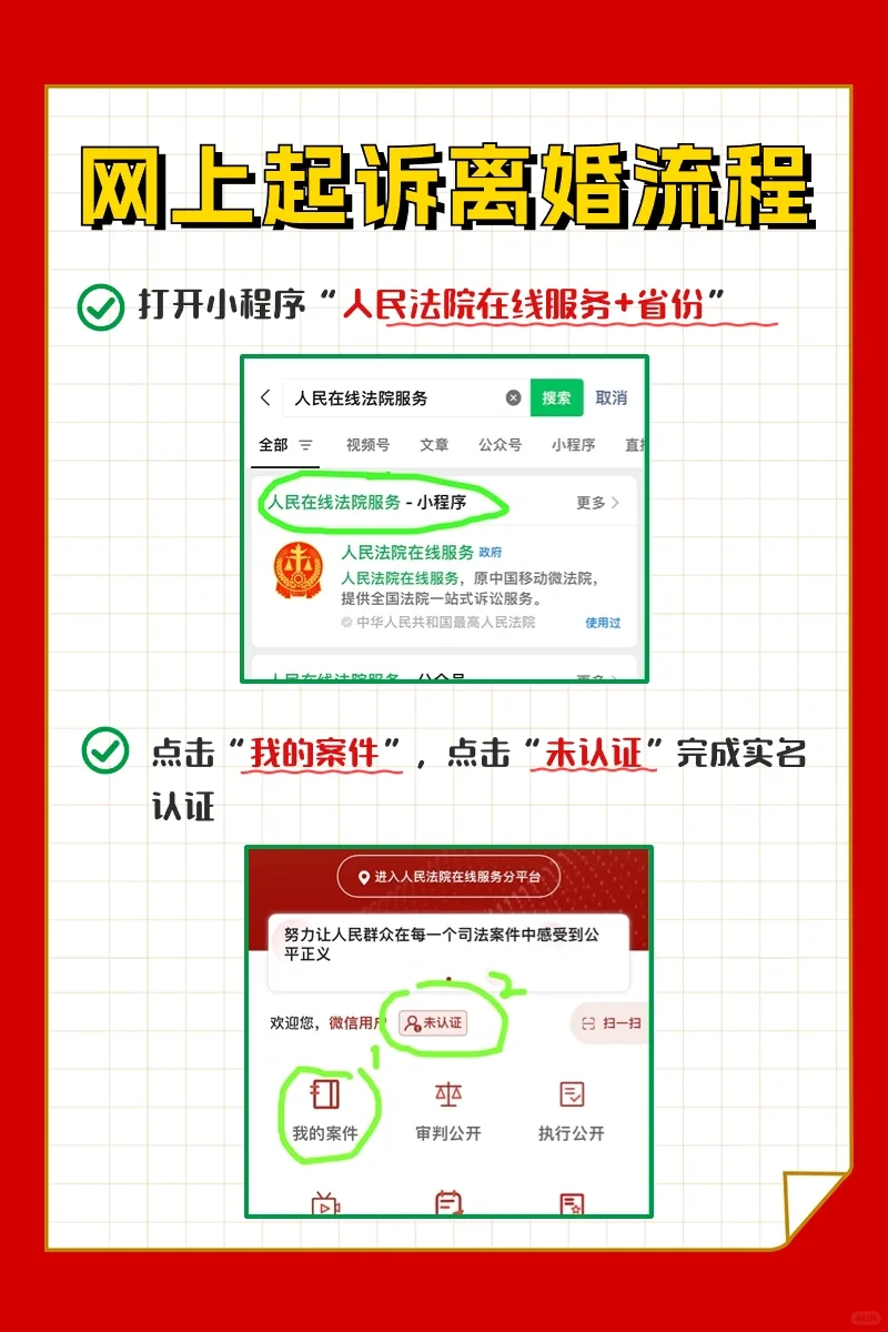 离婚没有冷静期,新的规定已经生效,现在离婚很方便,不用再忍受对方的折磨,对方恶意拖延也没用,可以网上起诉离婚,快速办理! 网上起诉离婚流程: 1、打开小程序“人民法院在线服务+省份 2、点击“我的案件”,点击“未认证”完成实名认证 3、点击“我要立案”-“审判立案” 4.弹出是否愿意接受第三方调解,选择“不愿意” 5.选择有管辖权的人民法院,一般标的额较小。案情简单的选区县级法院,然后选择民事一审“ 6.上传已准备好的材料到对应位置(其中带星号为必填项。