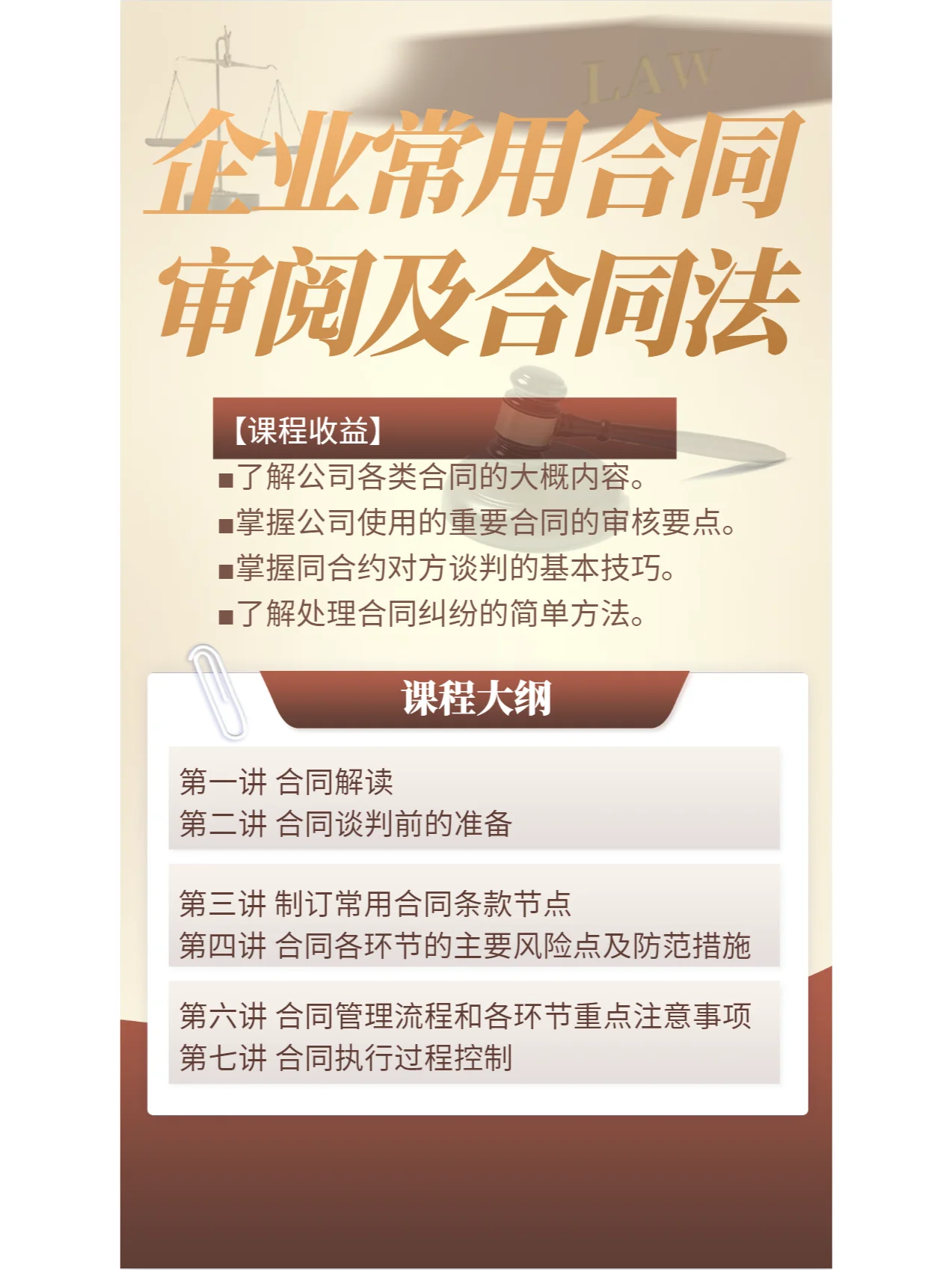 课程大纲 第1课合同的解释 1、 经济合同法解读 2、 合同类型和模式介绍 第2课合同谈判前的准备 第3课:制定通用合同条款的节点 1、 体现合同签订原则,确保合同条款的有效性 2、 签订合同前企业往来函件应注意的问题 (1) 注意“要约”和“接受” (2) 避免合同签订前的损失 3、 销售合同条款分析 1.合同目的条款 2.供货范围条款 3.质量条款 4.价格条款 5.付款条件 6.交货条款和条件 7.交货条件 8.验收条款 10.维护和售后服务条款 11.所有权转让条款 12.风险转移条款 13.安装条款 14.免责声明 15.违约责任条款 16.争议解决条款 17.不可抗力条款 合同各环节的主要风险点及防范措施 1、 目标合同风险及防范措施 2、 主观合同风险及防范措施 (1) 合同调查阶段 (2) 合同谈判阶段 (3) 合同文本部分 (4) 合同评审流程 (5) 合同签订流程 (6) 合同履行情况 (7) 合同结算 (8) 合同补充 (9) 合同修订 (10) 合同终止 (11) 合同登记 (12) 合同后评估 经典案例分析 第5课合同管理体系的建立 1、 建立分级授权管理体系 2、 实行统一集中管理 3、 明确合同法律服务部门的职责和权限 4、 明确相关岗位职责分工 5、 建立合同起草、咨询、审查、授权和批准制度 6、 建立合同执行情况跟踪和报告系统 7、 建立合同法律事项内部审计制度 8、 建立合同签订和责任履行制度 9、 建立合同评估和责任追究制度 经典案例分析 第六讲合同管理流程及各环节注意事项 1、 合同管理流程 2、 合同管理各个环节需要注意的要点 1.授权 2.信息跟踪 3.合同起草 4.谈判 5.审查 6.签字 7.密封件的使用 8.披露 9.职责分解 10.履行情况跟踪 11.变更 12.索赔 13.违约 14.终止 15.终止 16.储存 经典案例分析 第7课合同执行过程的控制 1、 合同管理体系要点 2、 具体合同的管理和实施 (1) 如何组织合同 (2) 如何创建合同执行分解图 (3) 重视合同执行的原则 (4) 如何预测合同中不明确条款的影响 (5) 如何应对几种可能的情况 经典案例分析 第八章:解决合同纠纷的方法和纠纷的处理 1、 解决合同纠纷的方法 2、 争议解决 (1) 处理纠纷的态度和心态 (2) 处理纠纷的分析方法 (3) 当出现争议时,一线谈判代表的工作任务 (4) 争议后协商一致后修改合同