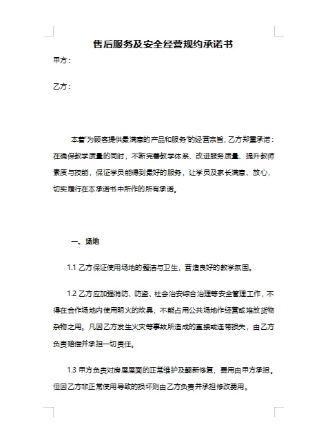 起草一份售后服务和安全运营承诺书的秘籍 今天我要和大家分享的是起草售后服务和安全管理条例承诺书的要点!一份好的承诺书,不仅为客户提供可靠的售后支持,也为企业的安全运营保驾护航。来和我一起获取这些秘密! 明确承诺的主体和对象 首先,在承诺书的开头,有必要清楚地说明承诺的主体(即企业或个人)和对象(即客户或关联方)。这可以让每个人一目了然,谁对谁做出了这一承诺。 售后服务内容及标准 接下来,就是售后服务的亮点!在本节中,有必要提供企业提供的售后服务的详细清单,如退换货政策、维修服务、技术支持等。同时,有必要明确服务标准,如响应时间、处理程序等,使客户能够清楚地了解他们可以享受的服务。 安全运行承诺及措施 安全经营是企业发展的基石,因此也应在承诺书中得到充分体现。我们必须明确承诺遵守相关法律法规,以确保我们的商业活动合法性。同时,要列出企业为确保安全运营所采取的具体措施,如定期检查、安全培训等,让客户和相关方感受到企业的责任感和专业性。 责任和义务 在承诺书中,还需要明确说明企业的责任和义务。这包括对客户的承诺,例如确保产品质量和提供高质量的服务;这也包括对社会的承诺,如遵守环境法规和保护员工权利。这可以使客户和利益相关者更加信任公司。 违约处理和争议解决 当然,任何合作都必然会遇到一些意想不到的情况。因此,在承诺书中,也有必要明确违约处理方式和纠纷解决机制。例如,如果一家公司没有履行承诺,该如何赔偿客户的损失;如果双方之间有争议,应该如何协商和解决。所有这些都可以使合作更加顺利。 温馨提醒 在起草承诺书时,建议企业首先进行全面自查,确保其售后服务和安全措施符合高标准。同时,还可以邀请客户和相关方参与讨论,听取他们的意见和建议,使承诺书更贴近实际需求。 最后,一份好的承诺书不仅是一种保证,也是一种信任。通过认真起草和履行承诺书,企业可以赢得客户的信任和支持,为企业的长期发展奠定坚实的基础。 好了,以上就是起草售后服务承诺书和安全操作规程的要点!希望这些秘密能够帮助到大家,让企业在保证安全运营的同时提供优质服务!