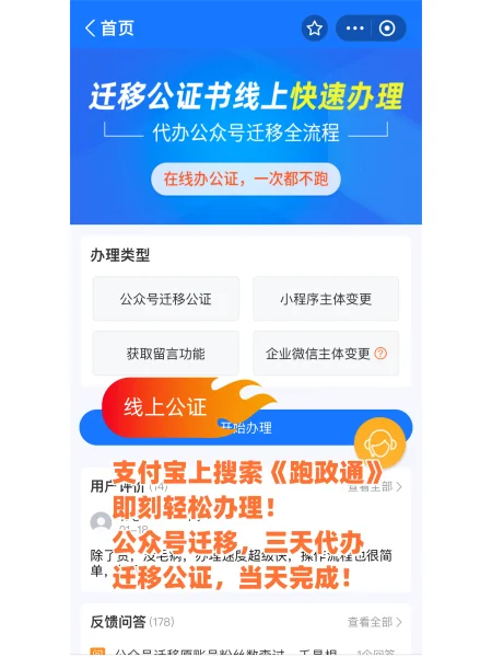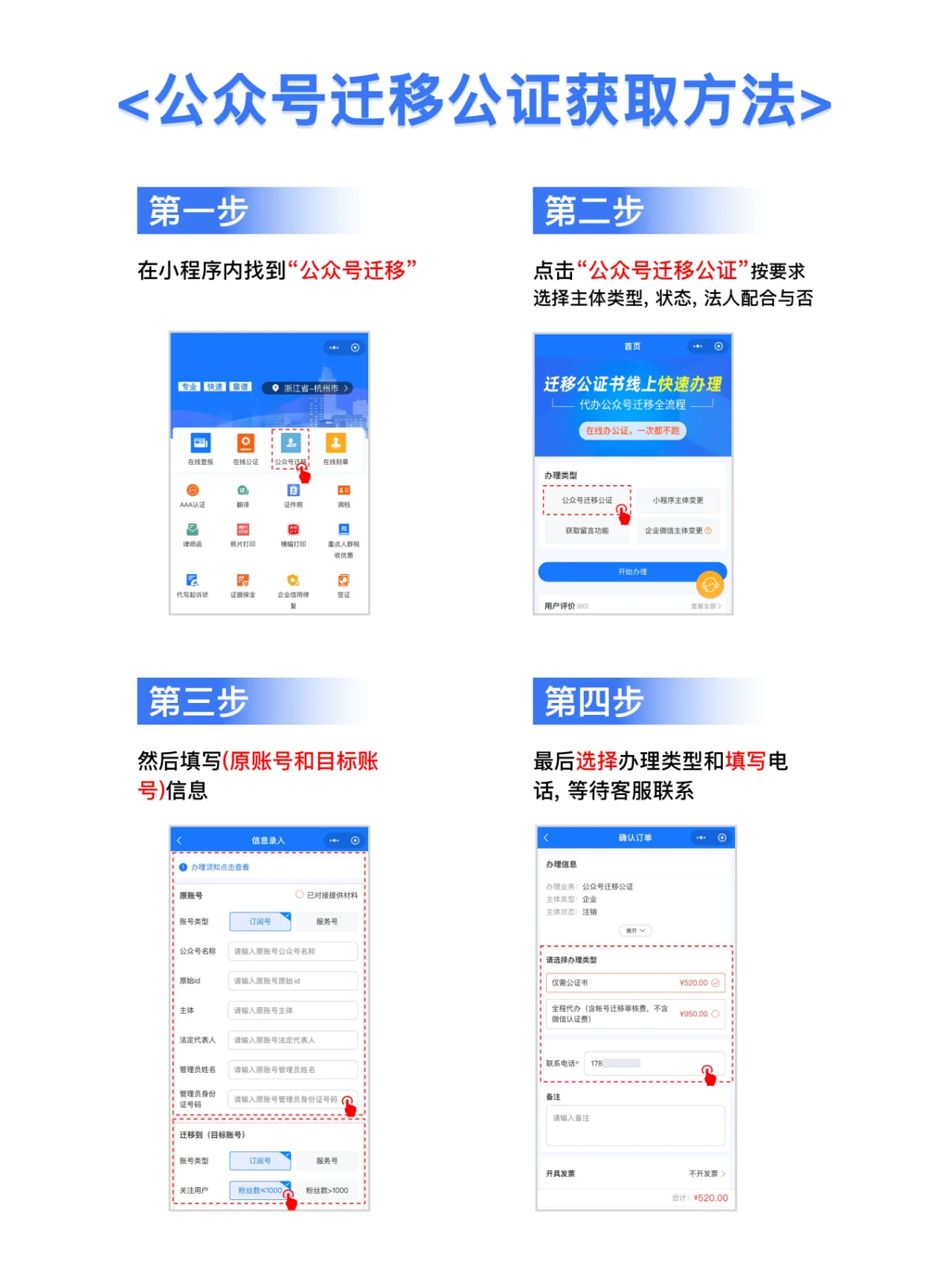 当涉及公众号迁移公证时,不必慌张,以下是一个清晰、分点归纳的办理流程,帮助你顺利完成迁移公证: 一、准备所需材料 主体资料: 公众号主体为个人的,提供居民身份证、公众号后台信息页面截图(需展示名称、身份证件和公众号主体信息)。 公众号主体为法人(公司)或其他组织的,提供营业执照(或组织机构证书)、法定代表人(或负责人)身份证及联系电话、公众号后台信息页面截图(需加盖公章)及公众号管理员身份证。 迁移申请函: 下载并填写《微信公众号迁移申请函》,并确保双方盖骑缝章。 二、线上办理公证 提交资料: 登录线上公证平台,上传上述所需材料,并填写相关个人信息。 选择送达方式: 根据需求选择公证书的送达方式,如电子版、纸质版或自取。 填写迁移函信息: 填写迁移函信息以及笔录等相关信息,确保信息准确无误。 确认并提交: 仔细核对所有信息后,确认申办并提交。 支付费用: 根据平台提示支付公证费用,费用通常只需传统公证的一半。 下载公证书: 办理完成后,下载电子版公证书或等待纸质版公证书的寄送。 三、提交迁移申请 登录原公众号: 在公众号后台的“主体信息”中找到“帐号迁移”,点击“开始迁移”。 提交迁移申请: 按照指引提交迁移申请,并上传公证书和其他必要材料。 等待审核: 提交申请后,等待微信官方审核,审核时间通常为1-3个工作日。 确认迁移: 审核通过后,双方管理员需确认迁移,并通知粉丝迁移事宜。 完成迁移: 迁移完成后,新账号将同步原账号的粉丝、文章素材等内容。 通过以上步骤,你可以顺利完成公众号迁移公证的办理。记得在操作前仔细阅读微信官方和相关平台的指引,确保流程正确无误。
