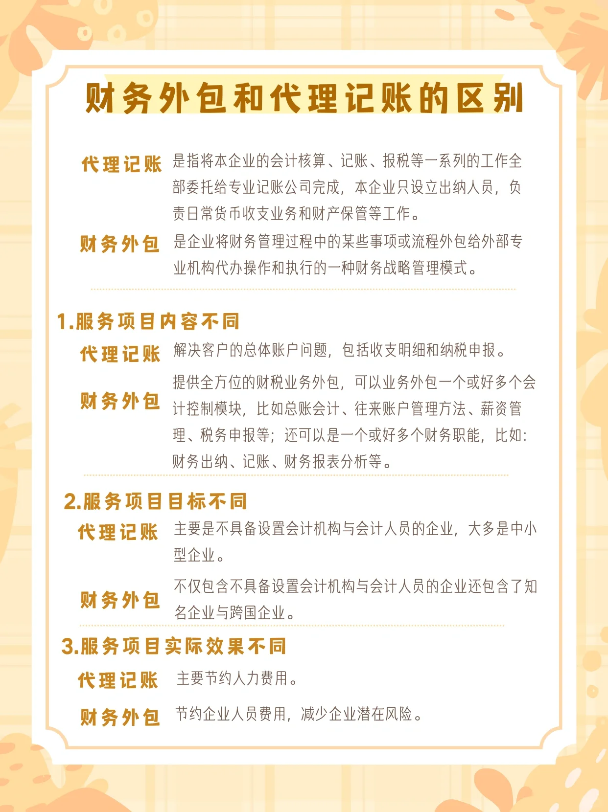 今天,我就和大家分享一下财务外包和外包记账的区别 代理记账 是指委托专业的会计公司为我公司完成会计、记账、纳税申报等一系列工作。我们公司只设立出纳,负责日常的货币交易和物业管理。 金融外包 它是企业将财务管理过程中的某些事项或过程外包给外部专业组织进行运营和执行的财务战略管理模式。 财务外包和外包会计主要在服务项目、服务目标和服务目标方面有所不同 1.不同的服务项目 代理记账 解决客户的整体账户问题,包括收入和支出明细以及纳税申报。 金融外包 全面的财税外包可以涉及外包一个或多个会计控制模块,如总账核算、活期账户管理方法、薪资管理、纳税申报等;它也可以是一个或多个财务功能,如财务出纳、记账、财务报表分析等。 2.不同的服务项目目标 代理记账 主要针对没有能力建立会计机构和人员的企业,其中大多数是中小企业。 金融外包 它不仅包括没有能力建立会计机构和人员的企业,还包括知名企业和跨国公司。 3.服务项目的实际效果不同 代理记账 主要节省人工成本。 金融外包 为企业节省人员成本,降低潜在风险。