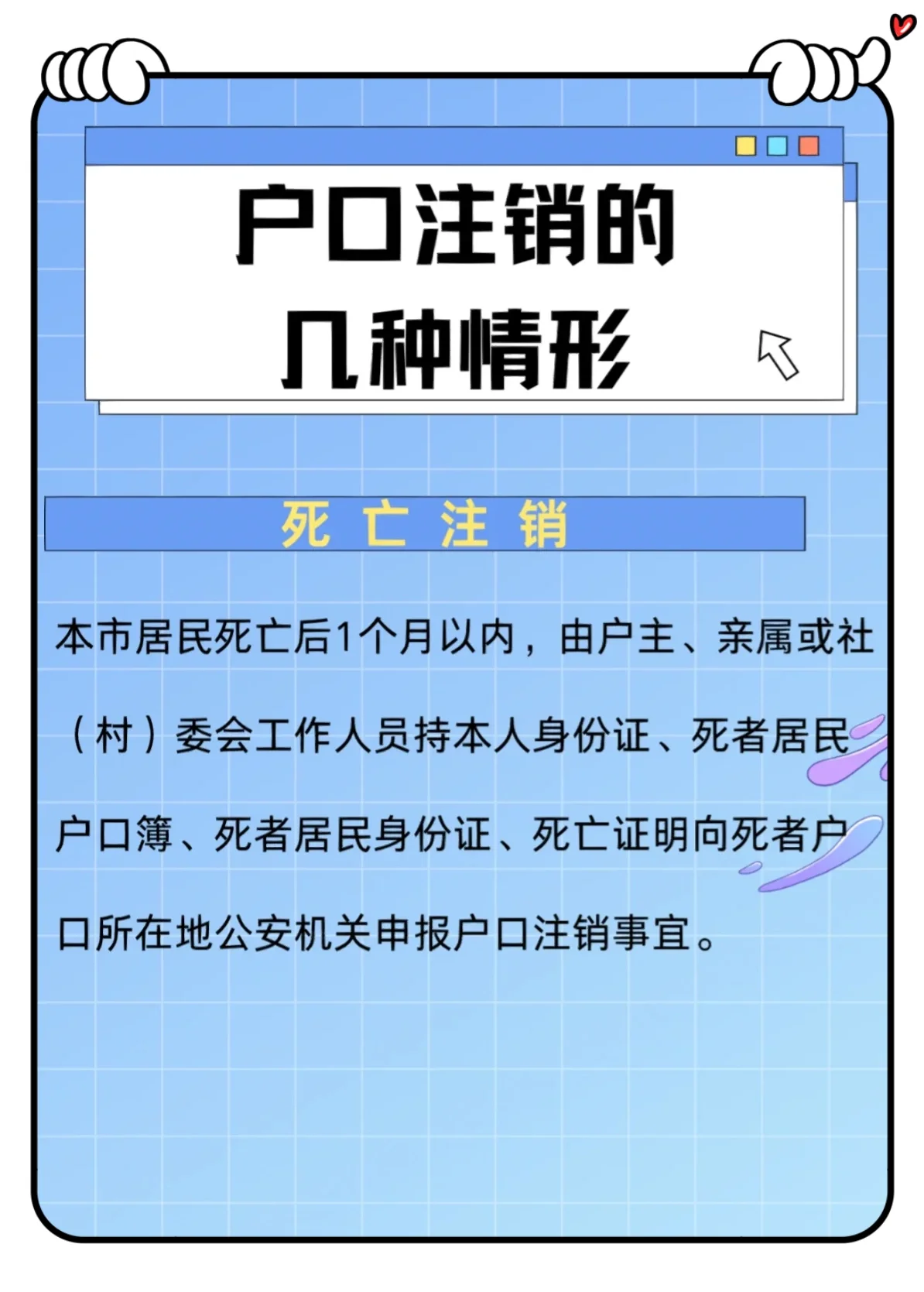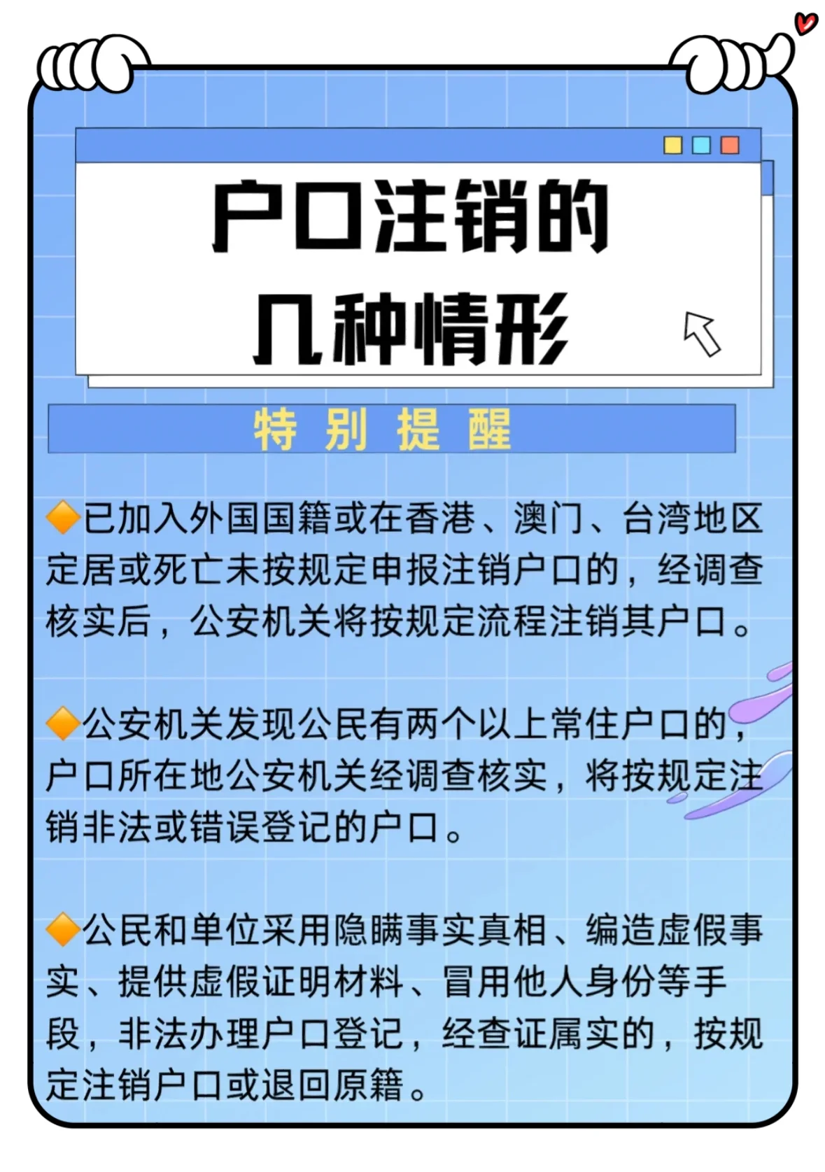 ️ 需要注销的几种情形‼️ 一、前往香港、澳门、台湾地区定居 经公安机关批准前往香港、澳门、台湾地区定居并取得永久居民身份的,应当由本人持居民户口簿、居民身份证、市级以上公安机关出入境管理部门出具的《注销户口通知书》(自行取得香港、澳门地区永久居民身份的,持永久居民身份正)到 所在地公安机关办理 注销事宜。亲属代办的还需提供代办人居民身份正。 二、加入外国国籍 已加入外国国籍的,应当由本人持居民 簿、居民身份正、公安机关出入境管理部门出具的《注销通知书》到 所在地公安机关办理注销事宜。亲属代办的还需提供代办人居民身份正。 三、死亡注销 本市居民死亡后1.个月以内,由户主、亲属或社(村)委会工作人员持本人身份正、死者居民簿、死者居民身份正、死亡证明向死者 所在地公安机关申报 注销事宜。 特别提醒 已加入外国国籍或在香港、澳门、台湾地区定居或死亡未按规定申报注销户口的,经调查核实后,公安机关将按规定流程注销其户口。 公安机关发现公民有两个以上常住户口的,户口所在地公安机关经调查核实,将按规定注销非法或错误登记的户口。 公民和单位采用隐瞒事实真相、编造虚假事实、提供虚假证明材料、冒用他人身份等手段,非法办理户口登记,经查证属实的,按规定注销户口或退回原籍。