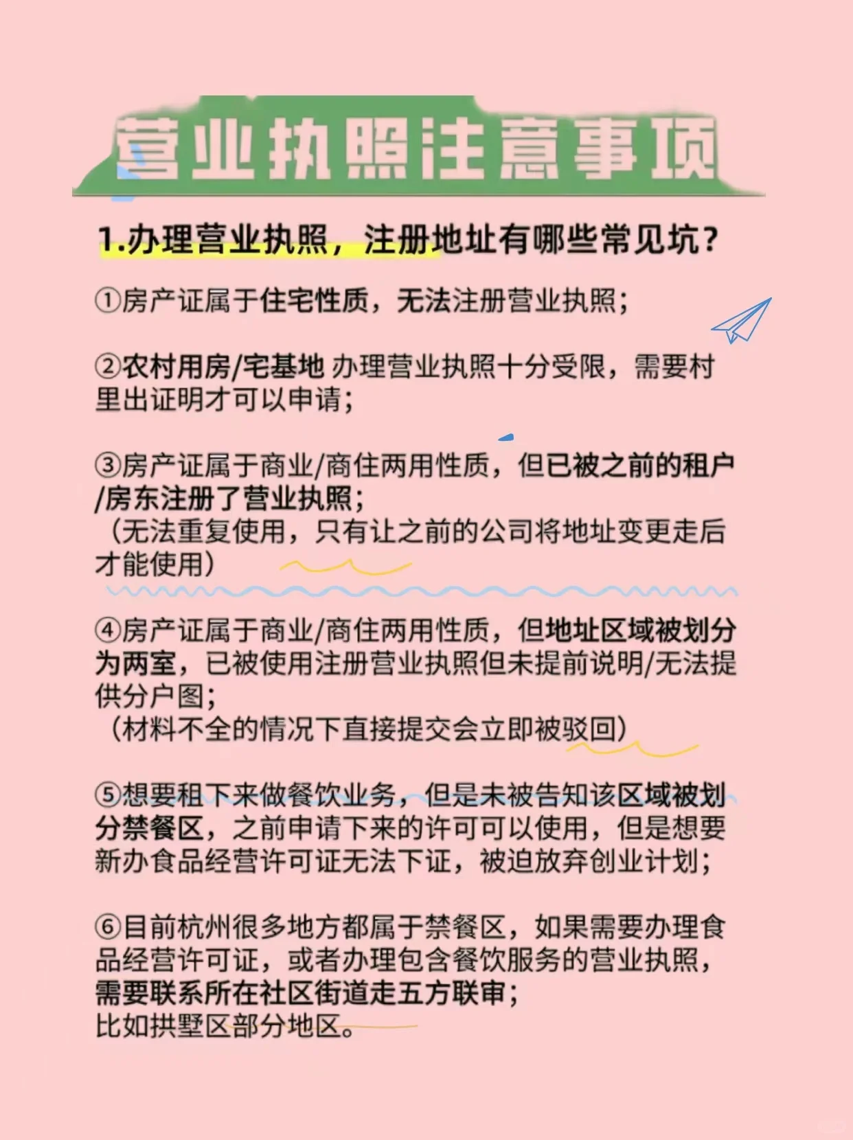 办理营业执照注意事项,注册地址有哪些常见坑 1.房产证属于住宅性质,无法注册营业执照; 2.农村用房/宅基地 办理营业执照十分受限,需要村里出证明才可以申请; 3.房产证属于商业/商住两用性质,但已被之前的租户/房东注册了营业执照;(无法重复使用,只有让之前的公司将地址变更走后才能使用) 4.房产证属于商业/商住两用性质,但地址区域被划分为两室,已被使用注册营业执照但未提前说明/无法提供分户图;(材料不全的情况下直接提交会立即被驳回) 5.想要租下来做餐饮业务,但是未被告知该区域被划分禁餐区,之前申请下来的许可可以使用,但是想要新办食品经营许可证无法下证,被迫放弃创业计划; 6.目前杭州很多地方都属于禁餐区,如果需要办理食品经营许可证,或者办理包含餐饮服务的营业执照,需要联系所在社区街道走五方联审;比如拱墅区部分地区。