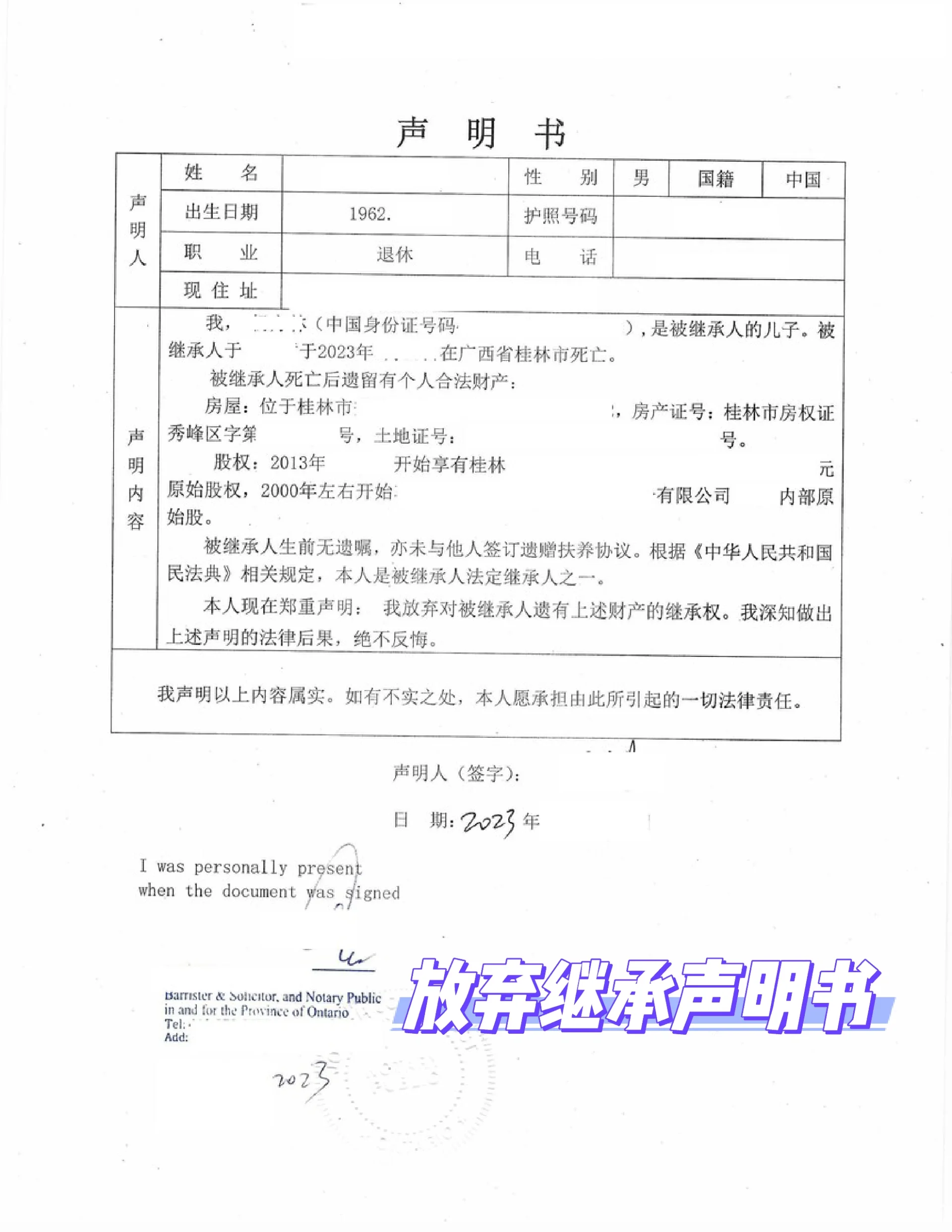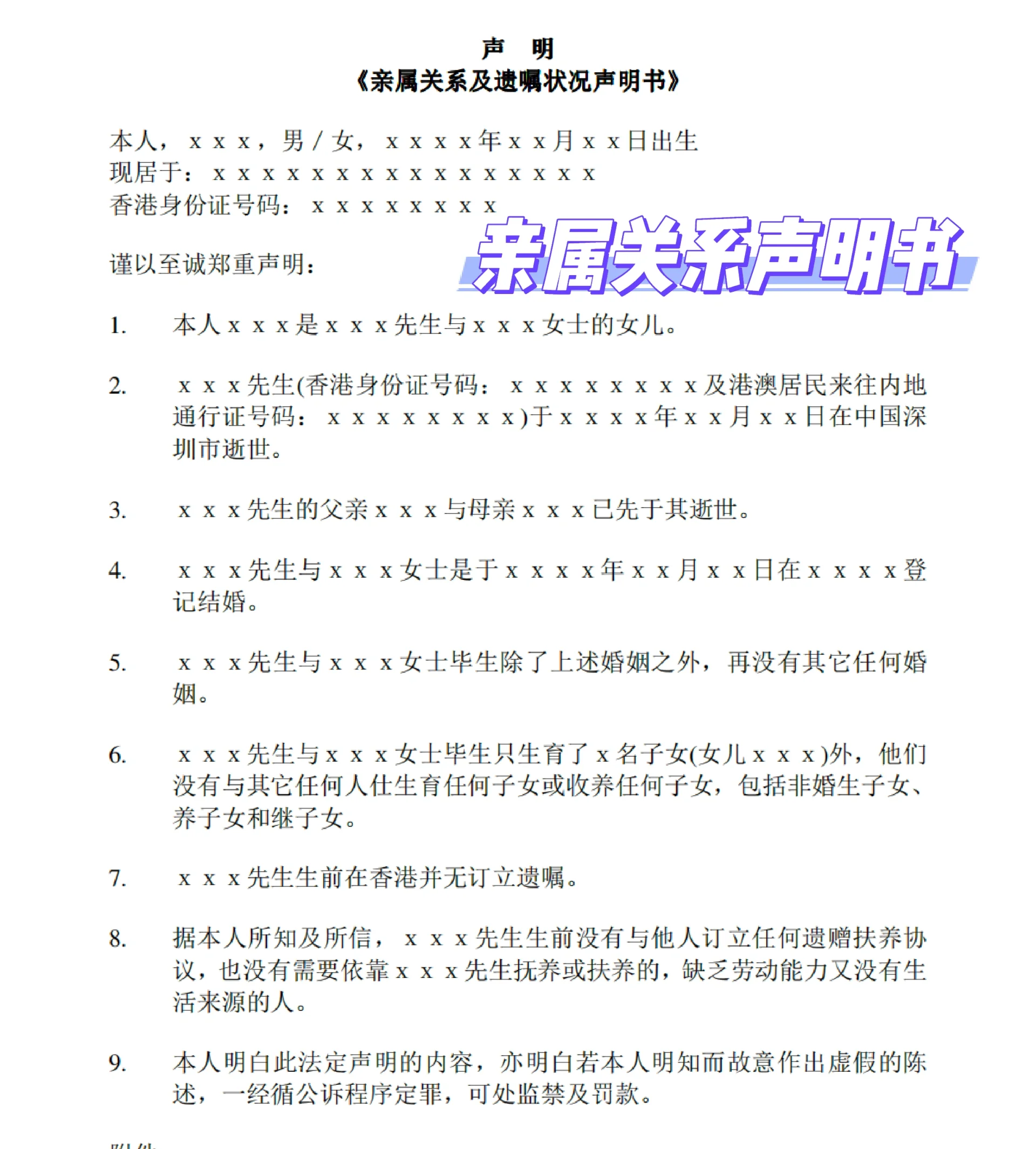 随着中外人员交往日益密切,中国公民、外国人为声明书办公证认证的数量日益增多。那么,究竟什么情况下需要用到声明书呢声明书公证认证该如何办理 这一篇带大家揭秘五种常见的声明书公证,你究竟需要哪种快来自查吧! 【同一人声明书】 办理同一人声明书公证的原因有: ①如您曾经持有中国护照、中国身份证在中国办理了房产买卖、开设银行账户、考取驾照等手续,现已加入外国国籍,在处理国内身份证登记的相关业务时需要出具一份同一人声明书公证。 ②说明原护照上的中文姓名与变更国籍后的护照姓名为同一人,新旧护照为同一人时需要出具一份同一人声明书公证。 【放弃继承声明书】 办理放弃继承声明书公证的原因有: 身为遗产的合法继承人之一,人在国外不想继承遗产,则可以办理一份放弃遗产继承权声明书并进行公证。 (遗产包括但不限于不动产、房产、机动车、银行存款、公司gu权、理财产品、股票、住房公积金等等) 【定居住址声明书】 办理定居住址声明书公证的原因有: 当事人居住在国外,在涉及到向中国境外转移财产、汇款或注销户口等事项时,需要对中国有关部门证明已经定居国外,或者需要证实其外国永居身份。就需要出具一份定居声明书公证。 【亲属关系声明书】 办理亲属关系声明书公证的原因有: 主要用于中外人员办理签证及其赴对方国家定居、探亲、旅游、留学、gou房、继承遗产、申请劳工伤亡赔偿、领取抚恤金等事项。 【单身声明书】 单身声明书包括未婚、离婚未再婚、丧偶未再婚。 办理单身声明书公证的原因有: 跨国恋结婚、财产继承、卖房等原因需要证明当事人婚姻状态。需要提供一份单身声明书公证。 办理声明书公证需要的材料: 1.声明书 2.申请人身份证户口簿 不同类型的声明书公证适用于不同的场合,选择合适的声明书公证类型,能更好保障自己的权益。