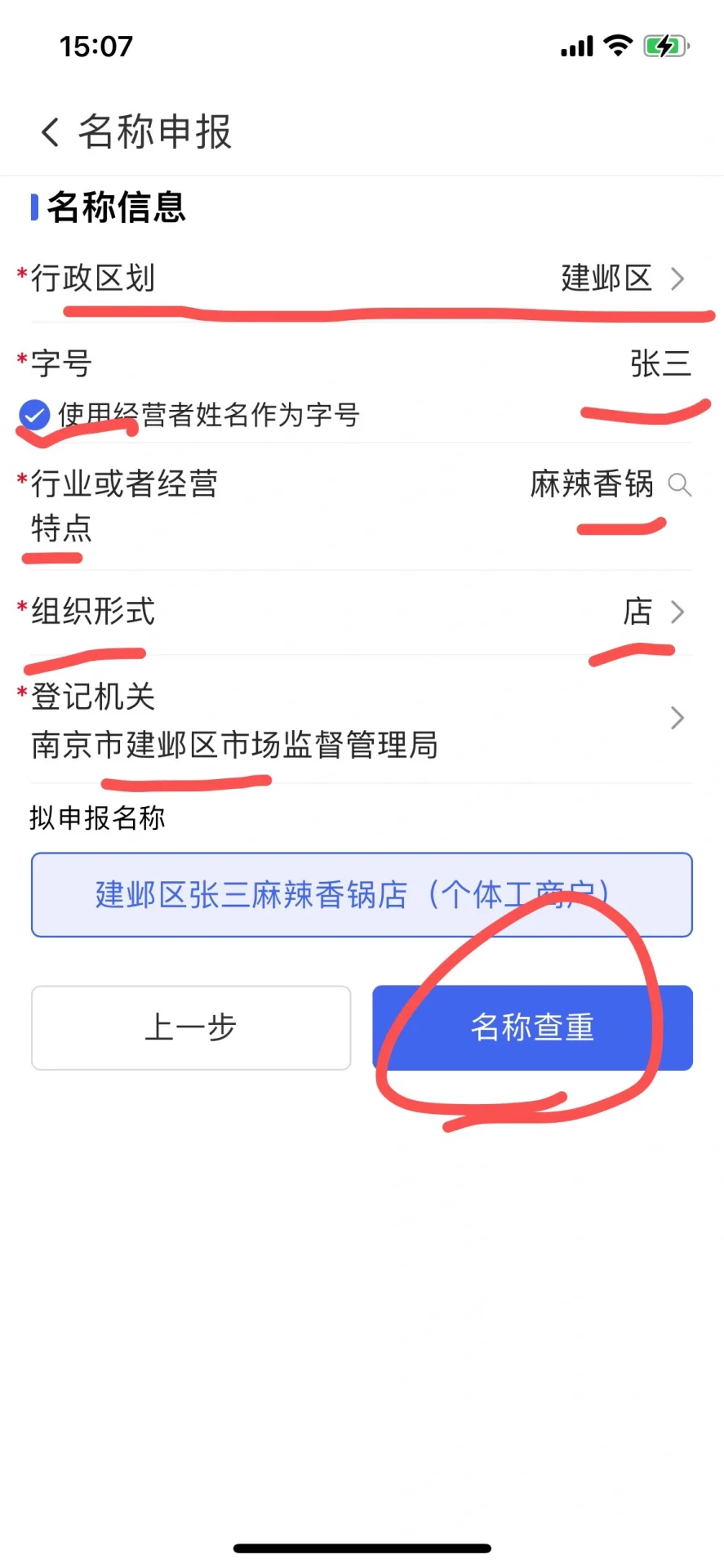 今天给大家分享个体工商户营业执照办理流程,首先和大家简单介绍下个体工商户与有限公司的区别,可根据自己实际经营情况选择办理哪一种: 1.组织形式上:个体户是:XX区+字号+行业+组织形式(店/工作室/中心/经营部);公司是:XX省/市+字号+行业+组织形式(有限公司)。个体户只能办一个,公司可以办多个分公司分支机构 2.税务核算方式不同,个体户税务核算简单,多数是“定期定额征收”,缴纳个人经营所得税,税率低,不需要每个月做账;公司是查账征收,需要每个月做账,收入减成本费用后 净利润部分 缴纳企业所得税。 3.承担责任不同,个体户承担个人无限连带责任,有限公司承担注册资本内有限责任。这也是大家更愿意注册公司的原因之一。 个体户营业执照注册流程: 1、手机下载江苏市监注册登记应用程序;实名注册登录后,(如图一)先选择名称申报,然后选择经营地址所在区域、填写一下注册资金(图二) 2、名称信息填写和查重,根据行政区域+字号+行业+组织形式,填写名称信息 例如:“建邺区张三麻辣香锅/餐饮/食品店” 字号可以使用经营者姓名。也可以自己取个名称,最后点查重,没有重名就可以提交登记。 3、名称申报成功后 会生成“自主申报号”。然后返回首页(图四)左上角,我要开办,填写名称 和自主申报号之后,填写经营者信息 经营地址信息(上传房产证和租赁合同照片)和经营范围。 4、填写完之后 等待系统生成材料,显示签名信息,就可以在首页 “电子签名”(图六)点进去按照流程做签名,做完后,签名任务是空的,会跳到右边 “已签名那里 5、除了电子签名之外,经营者还需要在 zfbao搜索小程序 “登记注册身份验证”,按照(图78910),完成身份核验、最后显示绿色的核验完成即可。 6、做完上述流程后,最后一张图会显示“内网受理中”等待工作人员审核完成,会显示“准予登记”。然后就可以去现场领取营业执照啦。