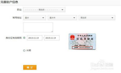 2.账户信息完善:包括职业、常用地址、身份证有效期,设置完毕后,最后点击“确定”按钮即可。