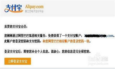 1.完成淘宝会员注册后,你会收到一封来自支付宝的邮件,提示大家获得一个免费的支付宝账户,但是登录支付宝后,需要完善、补全个人信息。按以下图示一步一步来就ok了。