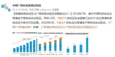 与此同时,广西自贸试验区出台相关政策,对各片区内新设的跨境电商公共服务平台运营企业予以重点支持,南宁、崇左片区先后获批国家级跨境电商综合试验区,钦州港片区获批跨境电商零售进口试点城市。