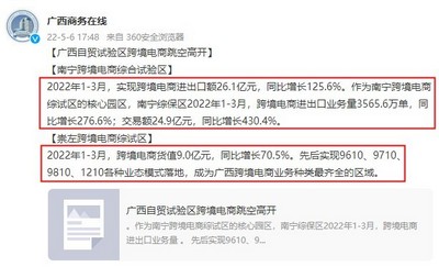 数据显示,2022年1-3月,南宁跨境电商综合试验区实现跨境电商进出口额26.1亿元,作为该综试区的核心园区,南宁综保区跨境电商进出口业务量达3565.6万单,交易额同比增长430.4%;崇左跨境电商综试区一季度货值9.0亿元,同比增长70.5%。