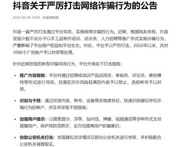 公告称,近期,根据网友举报,抖音发现少数不法分子以手工品制作培训、试衣员、人力招聘等推广形式实施诈骗行为,严重影响了平台用户权益和平台生态。对此,平台予以严厉打击,2022年以来,共对1006个广告账户予以封禁等处理。