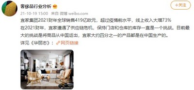 据宜家2021财年全年业绩数据显示,宜家2021财年全球门店及电商合计销售额达到419亿欧元(约合人民币3128亿元),相比2020年同期的396亿欧元增长5.8%。