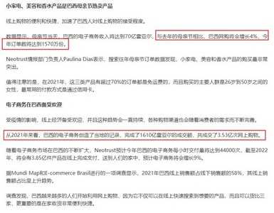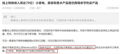 5月6日消息,据亿恩网消息,电子商务咨询公司Neotrust估计,5月8日当天(巴西母亲节),巴西的电子商务收入将达到70亿雷亚尔。结合往年母亲节订单,小家电、美容和香水产品是巴西母亲节热卖产品。