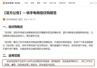 值得一提的是,近日,快手电商还发布了“信任购”规范公告。该规范于2022年4月首次发布并正式生效,适用于在快手小店平台经营的所有商家(跨境商家、拍卖商家等除外),除三方平台(有赞、魔筷、淘宝商品等)商品外,其余商品均适用。