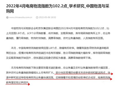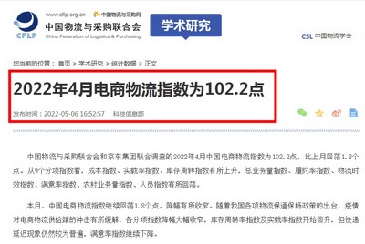 5月7日消息,日前,中国物流与采购联合会和京东集团联合调查的2022年4月中国电商物流指数公布。数据显示,2022年4月中国电商物流指数为102.2点,比上月回落1.8个点。从9个分项指数看,成本指数、实载率指数、库存周转指数有所上升,总业务量指数、履约率指数、物流时效指数、满意率指数、农村业务量指数、人员指数有所回落。