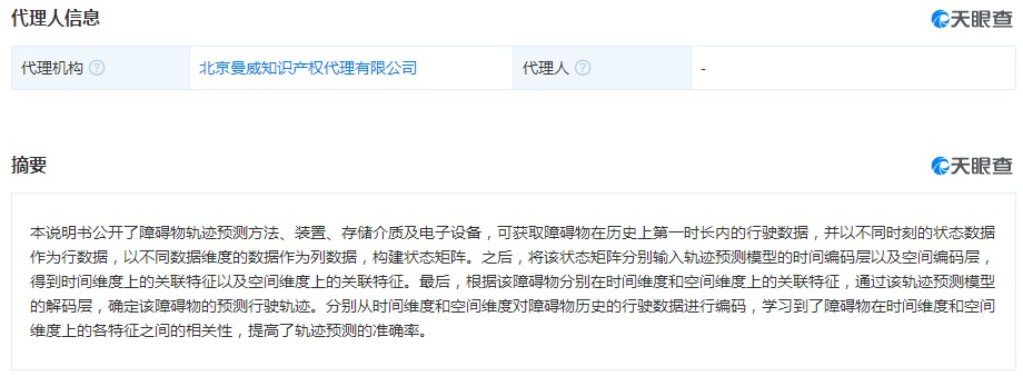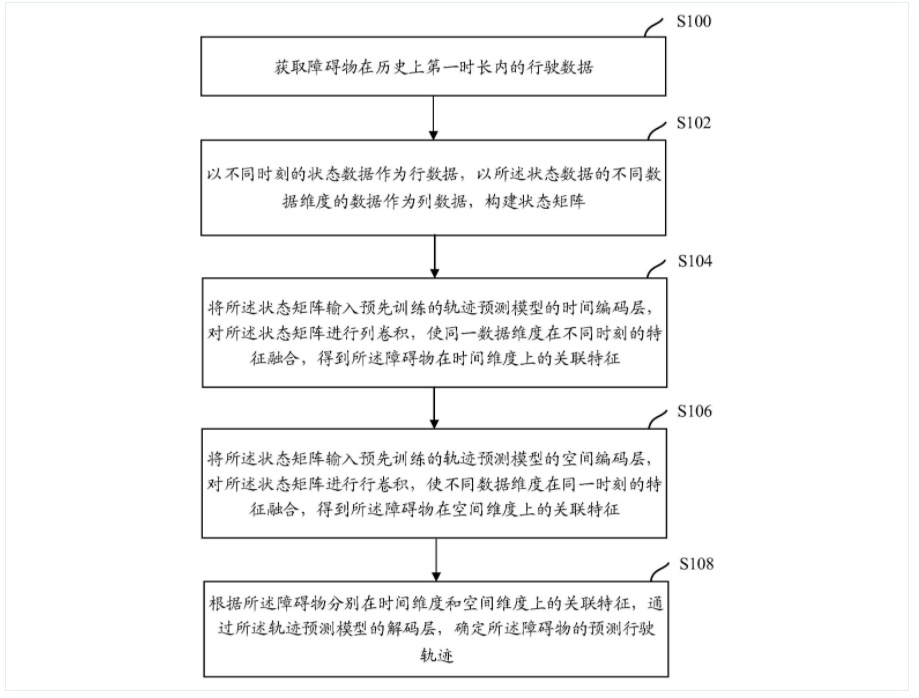 该专利摘要显示,本说明书公开了障碍物轨迹预测方法、装置、存储介质及电子设备,可获取障碍物在历史上第一时长内的行驶数据,并以不同时刻的状态数据作为行数据,以不同数据维度的数据作为列数据,构建状态矩阵。之后,将该状态矩阵分别输入轨迹预测模型的时间编码层以及空间编码层,得到时间维度上的关联特征以及空间维度上的关联特征。最后,根据该障碍物分别在时间维度和空间维度上的关联特征,通过该轨迹预测模型的解码层,确定该障碍物的预测行驶轨迹。分别从时间维度和空间维度对障碍物历史的行驶数据进行编码,学习到了障碍物在时间维度和空间维度上的各特征之间的相关性,提高了轨迹预测的准确率。