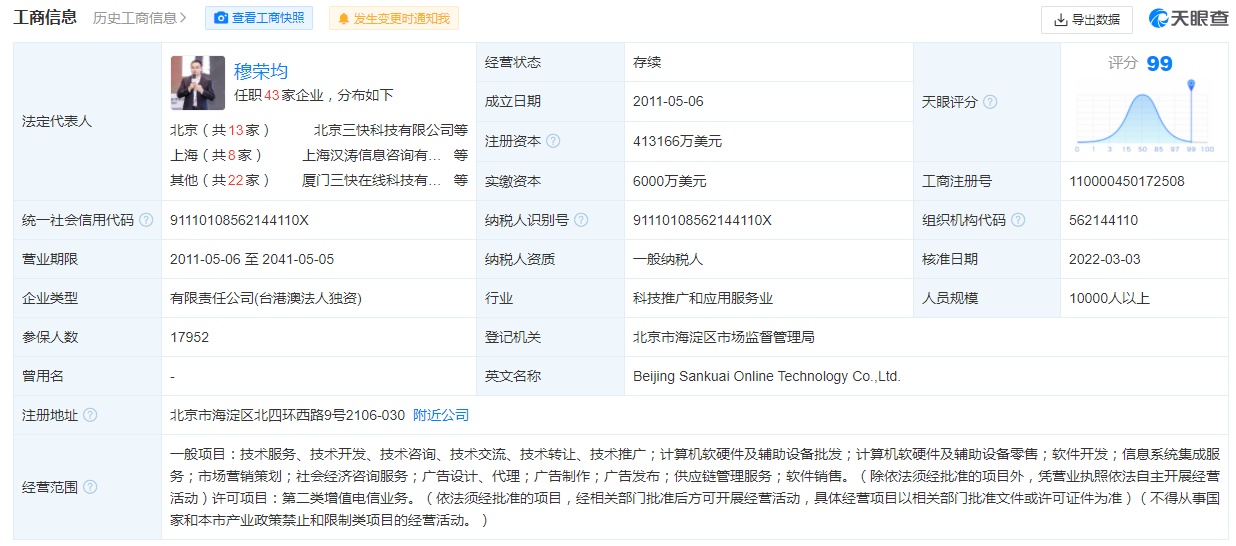 天眼查资料显示,北京三快在线科技有限公司成立于2011年5月,注册资本413166万美元,法定代表人为穆荣均,公司经营范围包括计算机软件技术、网络技术开发;技术转让、技术服务、技术咨询;计算机系统集成;企业营销策划;经济贸易咨询;销售自行开发的软件产品;批发计算机硬件及其配套设备;基础软件服务;应用软件服务;设计、制作、代理、发布广告;供应链管理。