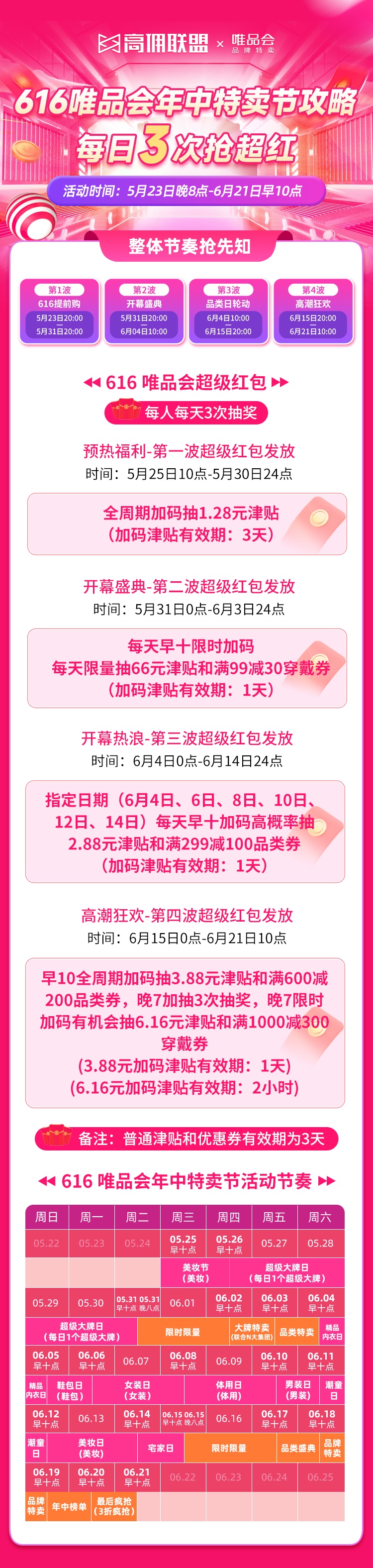 此外,6.16大促活动期间,唯品会还会发放四波超级红包,每个用户每天可抽三次。