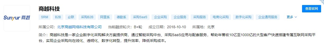 天眼查资料显示,商越科技是面向大中型企业提供数字化采购解决方案的智能公司,通过商越的智能采购中台、SaaS应用及运营服务帮助客户搭建专属的采购互联网平台,让企业采购全程在线化、数字化、智能化,为企业提升效率、降低成本。