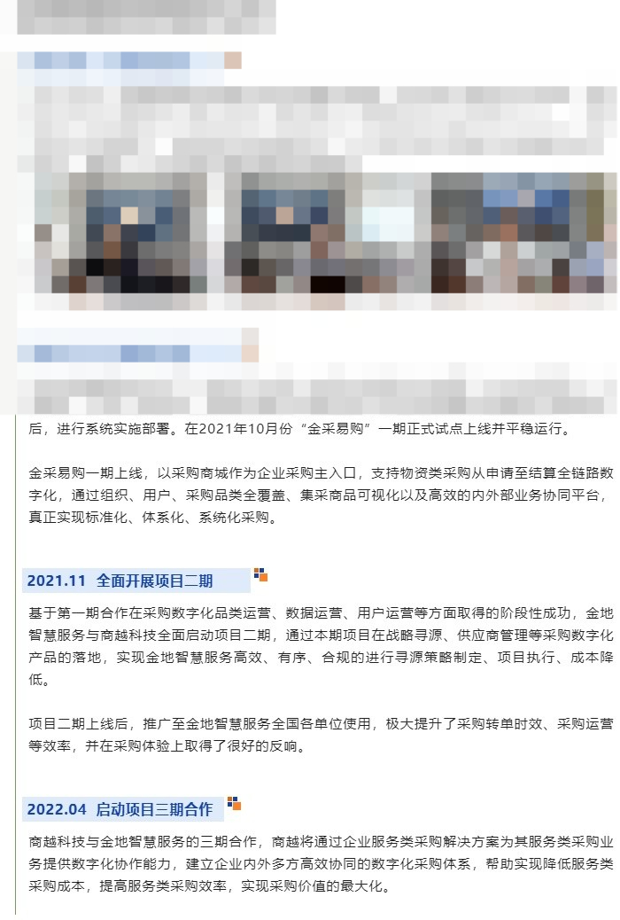 对外合作动态方面,近日,金地智慧服务集团公司(以下简称“金地智慧服务”)与商越科技展开采购数字化第三期合作。基于第三期的合作,双方将进一步升级物业行业企业采购数字化解决方案。