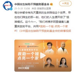 此前,阿里健康公益已与中国出生缺陷干预救助基金会签约,表示将进一步拓宽覆盖区域,给更多地区家庭经济困难的出生缺陷患儿家庭提供就医爱心通道、优质诊疗资源、报销部分治疗费用和就医过程的交通住宿费用等。