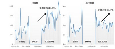 此外,报告显示了甘肃省景泰县在今年2至5月的出行量和平均出行距离变化。数据显示,在进入复工复产期后,共享电单车的出行量较之前提升了80.8%,平均出行距离提升了10.6%。说明在复工复产阶段,市民更倾向于选择共享电单车出行,且共享电单车承担了更长距离的出行服务。