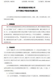6月2日消息,顺丰控股股份有限公司(以下简称顺丰控股或公司)日前发布关于回购公司股份的进展公告(以下简称公告)。