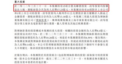 阿里影业三项最大投资为博纳影业、乐华娱乐、亭东影业,分别主要涉及电影制作发行业务、艺人管理及其他泛娱乐业务。其中对博纳影业的投资构成集团的重大投资,相关的投资金额约为8.4亿元,而投资占比约7.72%。于2022年3月31日,集团对博纳影业的长期股权投资账面价值约为10.26亿元,相当于集团总资产的6.59%。