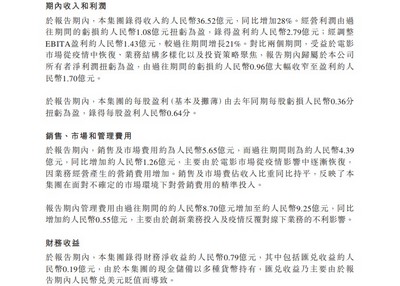 支出方面,于报告期内,销售及市场费用约为5.65亿元,而过往期间则为约4.39亿元,同比增加约1.26亿元,主要由于电影市场从疫情影响中逐渐恢复,因业务经营产生的营销费用增加。