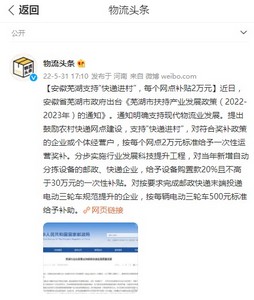 另据了解,近日,安徽省芜湖市出台《芜湖市扶持产业发展政策(2022-2023年)的通知》。通知明确支持现代物流业发展。提出鼓励农村快递网点建设,支持“快递进村”,对符合奖补政策的企业或个体经营户,按每个网点2万元标准给予一次性运营奖补。