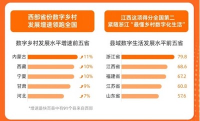 阿里研究院表示,数字技术有望缩小东西部差距,西部地区在本次研究中表现较为突出。数字乡村指数增速最快的前五依次为内蒙古(11%)、西藏(10%)、宁夏(10%)、甘肃(9%)和河北(7%)。前四名被西部省份包揽,增长最快百县中有91个来自西部。