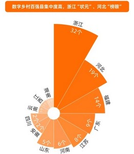 据了解,数字乡村指标体系涵盖基础设施、经济、治理、生活四个领域。本次研究对象为农业GDP占比大于3%的2481个县区,上榜百强县前五的省份为浙江(32个)、河北(19个)、福建(14个)、广东(9个)和江苏(8个)。
