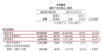 研发开支由2021年第一季度的人民币35亿元增加至2022年同期的人民币49亿元,占收入百分比由9.4%同比上升1.1个百分点至10.5%。金额及占收入百分比的增加均主要由业务扩展所带动的雇员福利开支增加所致。