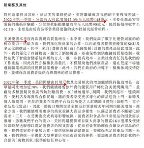 新业务及其他分部方面,2022年第一季度,分部收入同比增加47.0%至人民币145亿元,主要受商品零售业务的扩张所驱动。分部经营亏损继续收窄至人民币90亿元,经营亏损率收窄至62.3%,主要是由于商品零售业务更强的成本控制及经营杠杆。