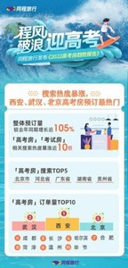 另外,同程旅行今日发布《2022高考房预订趋势报告》。数据显示,截至6月1日,今年“高考房”整体预订量较去年同期增长近105%,四星及五星酒店订单量同比增长近20%。