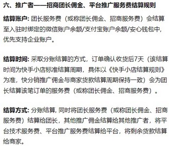 据了解,快分销采取分账结算方式,订单确认收货后7天同时将货款中出让的推广佣金结算给平台推广者,包括达人/招商团长/快赚客,将服务商直播运营服务佣金结算给服务商,将平台技术服务费、平台推广服务费结算给平台,将剩余货款结算给商家。