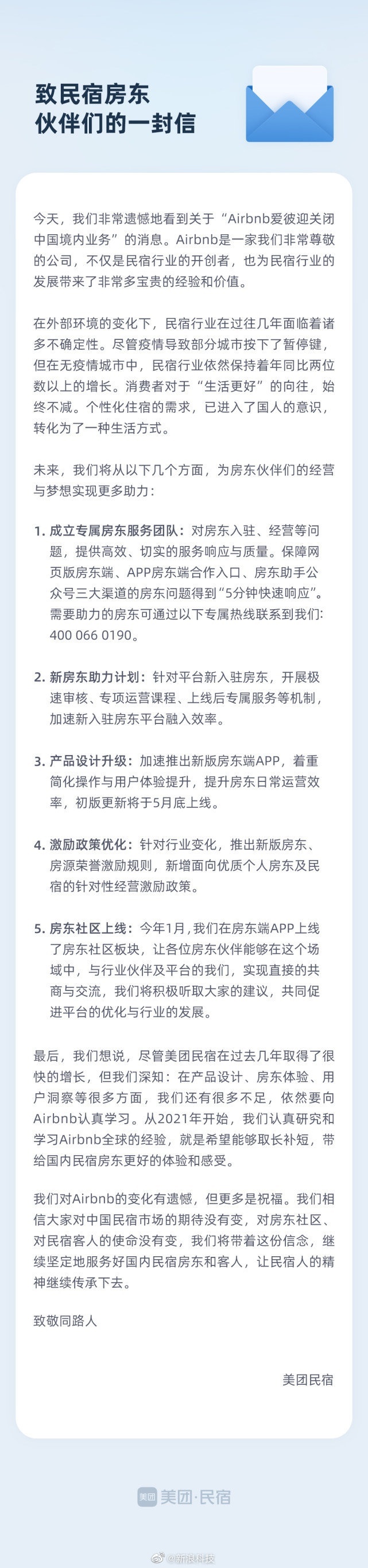 值得注意的是,在Airbnb宣布退出当日,美团、途家、小猪等多家行业平台曾发布了帮助Airbnb房东继续经营的政策,并表达了遗憾和祝福。其中,美团民宿表示,将组建专职房东服务团队,上线入驻极速审核服务,推出新版的房东端App等等,帮助房东更快融入新社区。