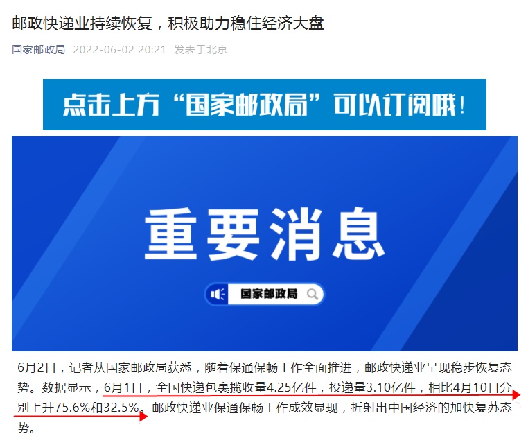 值得注意的是,在上海,随着全市正常生产生活秩序的全面恢复,6月1日起,当地邮政快递业有序恢复处理中心和营业网点,逐步全面恢复个人寄递服务。数据显示,6月1日,上海市快递包裹揽收量突破千万件,投递量突破500万件。预计随着上海市复工复产的推进,6月中旬业务量可恢复至七成左右。
