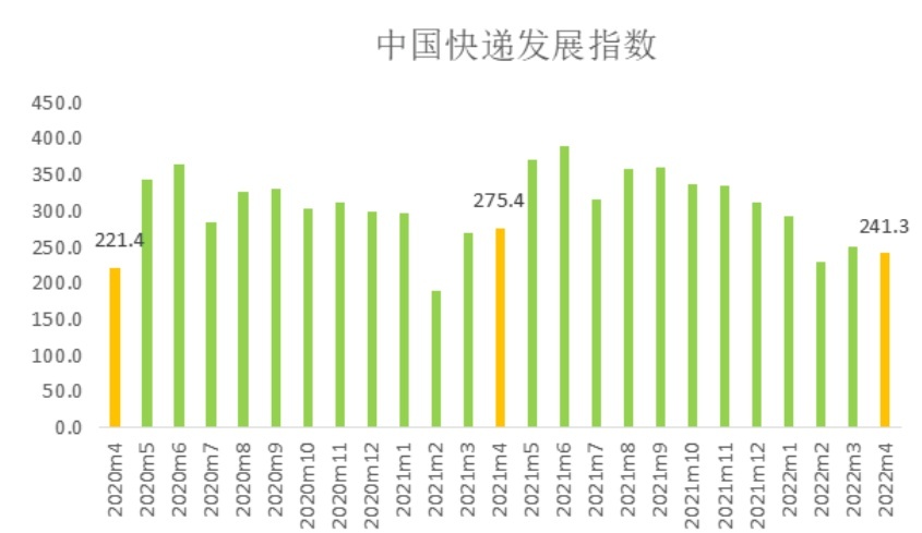 值得一提的是,此前,国家邮政局公布的数据显示,经测算,2022年4月中国快递发展指数为241.3,环比下降3.9%。其中发展规模指数和发展能力指数,分别为286.5和170.9,环比分别下降11.8%和9%,服务质量指数和发展趋势指数分别为325和65.6,环比分别提升7.1%和5.1%。
