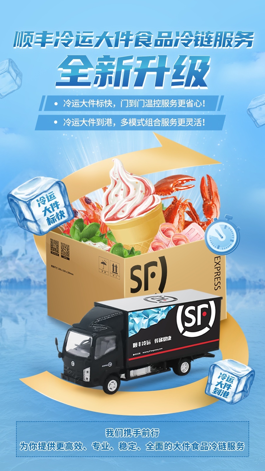 值得一提的是,近日,顺丰冷运宣布,2022年顺丰冷运大件食品冷链服务全新升级,通过冷运大件标快、冷运大件到港等产品提供更高效、专业的大件食品冷链服务。