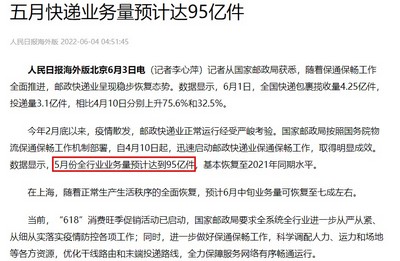 数据显示,5月份全行业业务量预计达到95亿件,基本恢复至2021年同期水平。在上海,随着正常生产生活秩序的全面恢复,预计6月中旬业务量可恢复至七成左右。