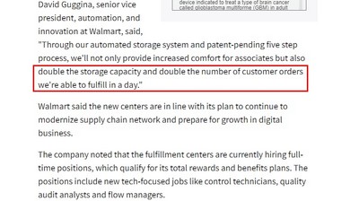 沃尔玛自动化和创新高级副总裁David Guggina说:“通过我们的自动化存储系统和正在申请专利的五步流程,我们不仅可以为员工提供更高的舒适度,还可以将存储容量和数量翻倍,能够在一天内完成的客户订单。”