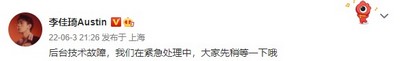 6月3日晚9点26分,李佳琦通过其微博发文称:“后台技术故障,我们在紧急处理中,大家先稍等一下哦”。晚些时候,李佳琦再次发文表示,“MM们,非常抱歉,今晚因为我们内部设备故障无法继续直播,大家早点休息,尚未上播的产品,我们之后的直播中会陆续带给大家,辛苦大家了。”