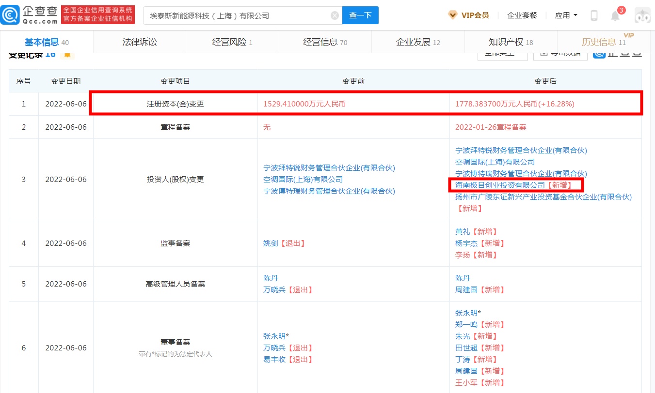 6月7日消息,企查查信息显示,6月6日,埃泰斯新能源科技(上海)有限公司发生工商变更,新增小米关联公司海南极目创业投资有限公司为股东,持股15.68%。同时,该公司注册资本由1529.41万元增加至1778.38万元,增幅16.28%。