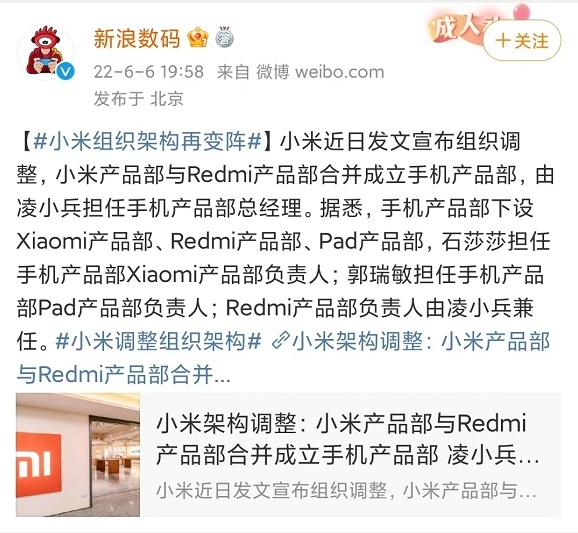 值得一提的是,近日,小米发文宣布组织调整,小米产品部与Redmi产品部合并成立手机产品部,由凌小兵担任手机产品部总经理。